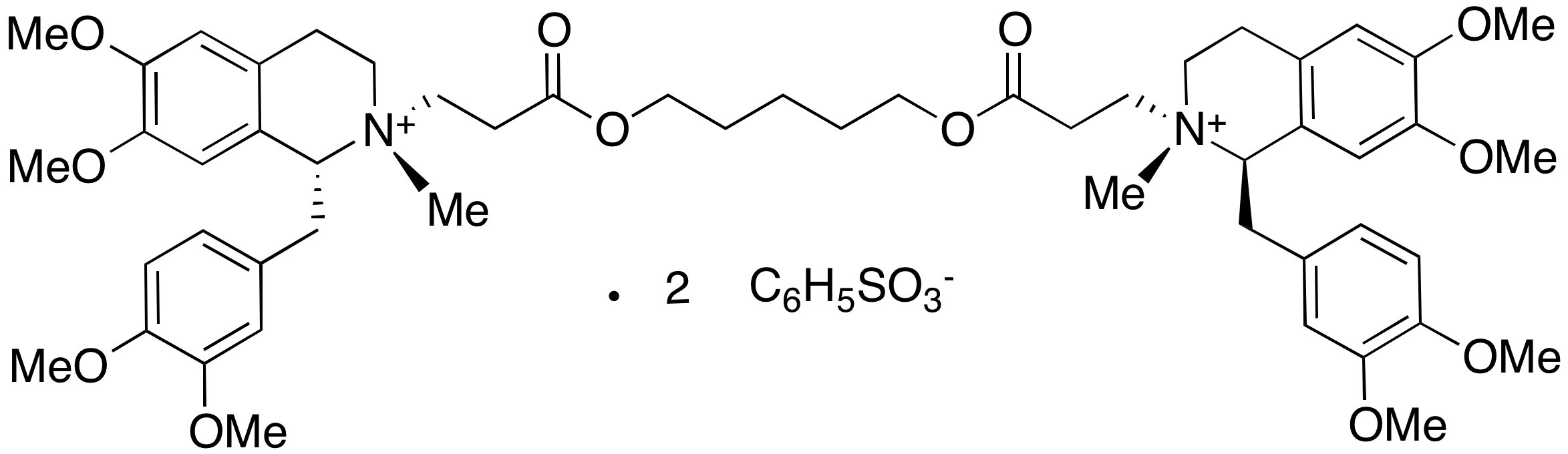 Size quantity: 1-EA Description: SMILES: COc1ccc(C[C@@H]2c3cc(OC)c(OC)cc3CC[N@+]2(C)CCC(=O)OCCCCCOC(=O)CC[N@+]4(C)CCc5cc(OC)c(OC)cc5[C@H]4Cc6ccc(OC)c(OC)c6)cc1OC.[O-]S(=O)(=O)c7ccccc7.[O-]S(=O)(=O)c8ccccc8 Purity: