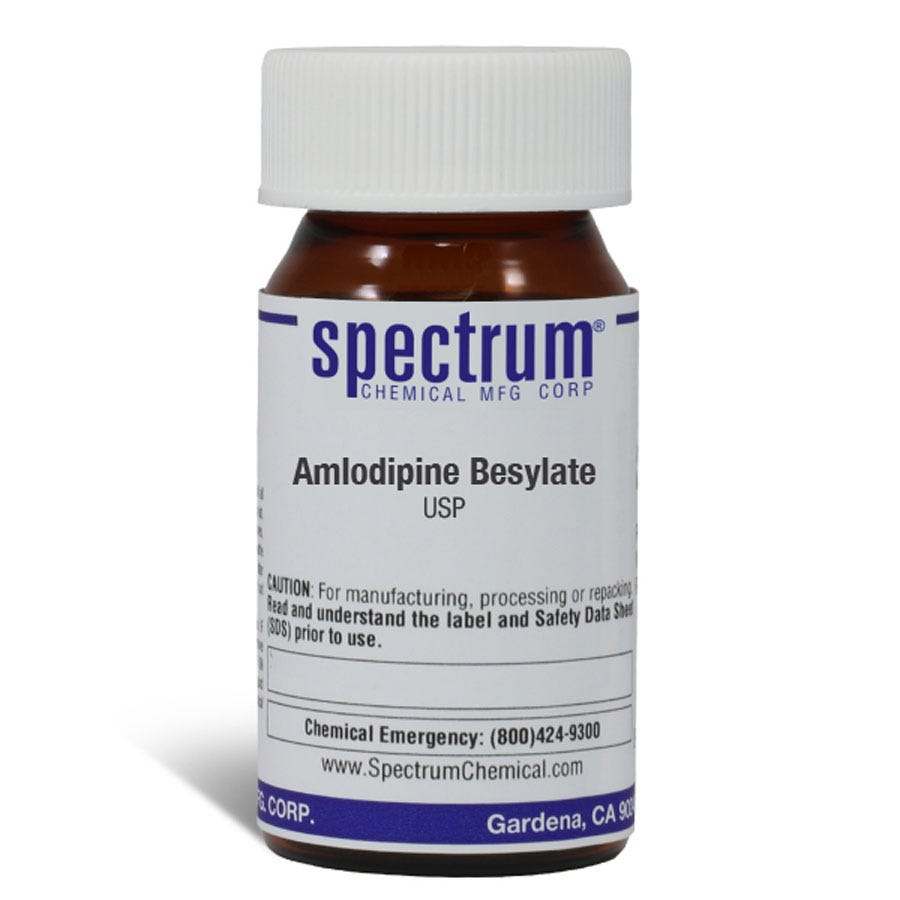 Size quantity: 1-EA Description: Amlodipine Besylate, USP. Spectrum Chemical graded products (USP/NF, EP, BP, JP, FCC) are handled, packaged, labeled, stored, and tested in FDA registered and inspected facilities. All operations are conducted in compliance with current Good Manufacturing Practices (cGMP) as defined in 21 CFR Parts 210 and 211. Furthermore, the original manufacturers of these materials adhere to appropriate GMP standards, such as ICH Q7 Good Manufacturing Practice Guide for Active Pharmaceutical Ingredients or FDA 21 CFR Parts 210 and 211, ensuring the highest quality and regulatory compliance throughout the supply chain.