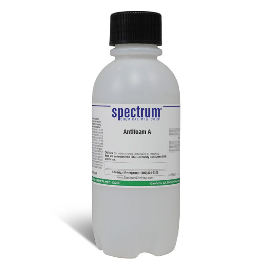 Size quantity: 1-EA Description: Antifoam A is also known as polydimethylsiloxane and is part of a group of polymeric organosilicon compounds known as silicones. It is a chemical additive that reduces and hinders the formation of foam in industrial process liquids. Ungraded products supplied by Spectrum are indicative of a grade suitable for general industrial use or research purposes and typically are not suitable for human consumption or therapeutic use.