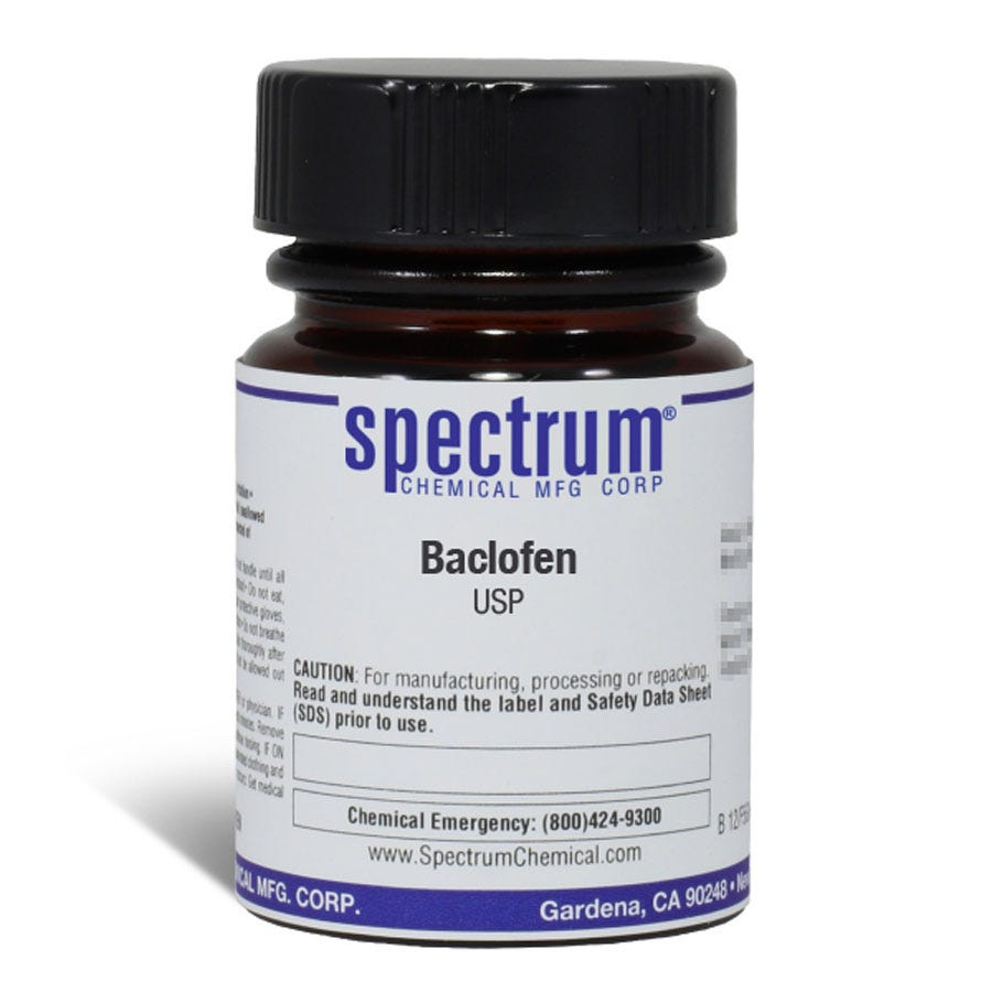 Size quantity: 1-EA Description: Baclofen, USP. Spectrum Chemical graded products (USP/NF, EP, BP, JP, FCC) are handled, packaged, labeled, stored, and tested in FDA registered and inspected facilities. All operations are conducted in compliance with current Good Manufacturing Practices (cGMP) as defined in 21 CFR Parts 210 and 211. Furthermore, the original manufacturers of these materials adhere to appropriate GMP standards, such as ICH Q7 Good Manufacturing Practice Guide for Active Pharmaceutical Ingredients or FDA 21 CFR Parts 210 and 211, ensuring the highest quality and regulatory compliance throughout the supply chain.