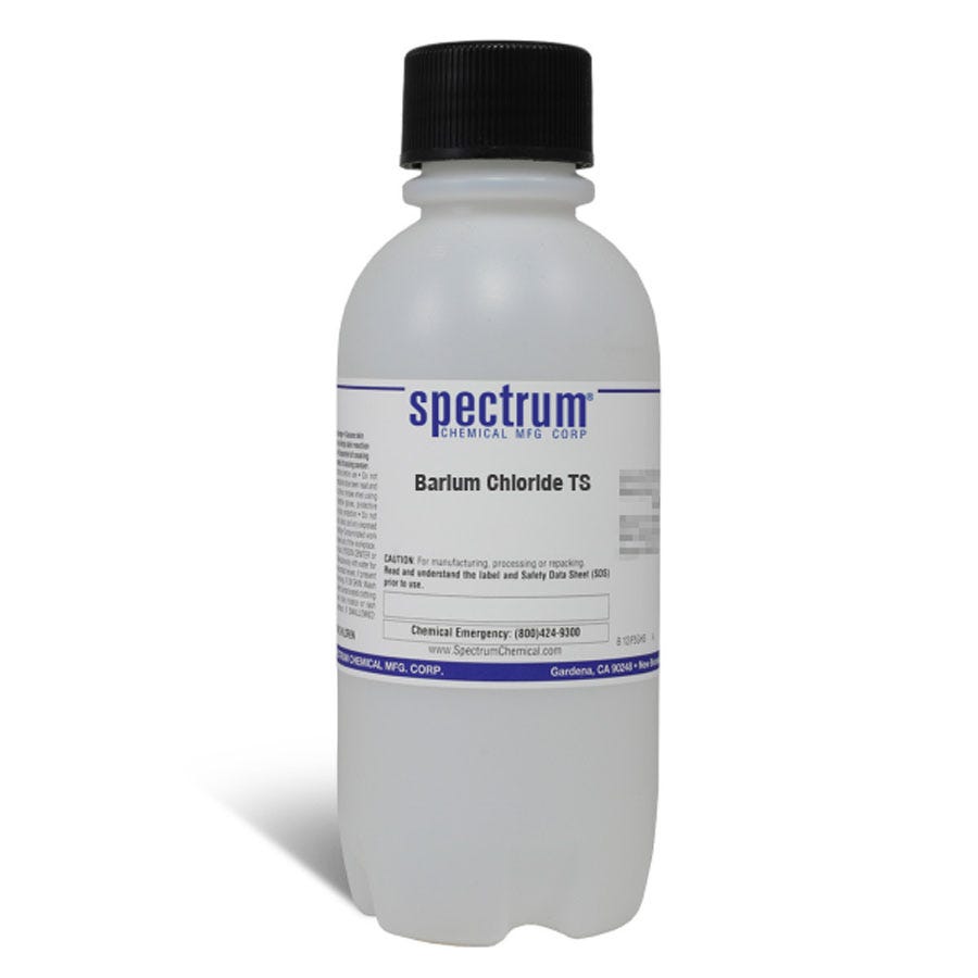 Size quantity: 1-EA Description: Barium Chloride TS, (U.S.P. Test Solution) is a ready-for-use solution for the purpose of conducting USP, National Formulary and assay tests and is prepared according to the specifications of the USP Pharmacopeial Convention.