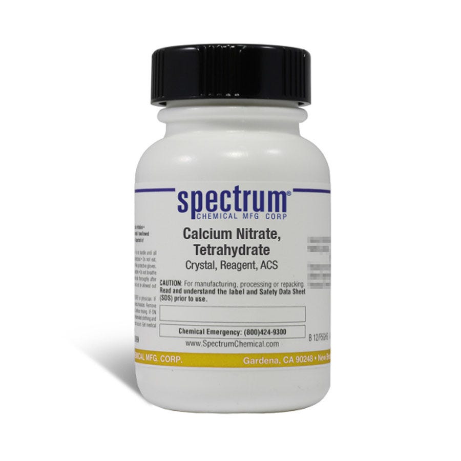 Size quantity: 1-EA Description: Calcium Nitrate, Tetrahydrate, Crystal, Reagent, ACS is a colorless solid that absorbs moisture from air. Calcium nitrate is used mainly as a component in fertilizer and in the manufacturing of cooling packs. As an ACS grade quality reagent, its chemical specifications are the de facto standards for chemicals used in many high-purity applications and typically designate the highest quality chemical available for laboratory use. Spectrum Chemical manufactured Reagent ACS grade products meet the toughest regulatory standards for quality and purity.