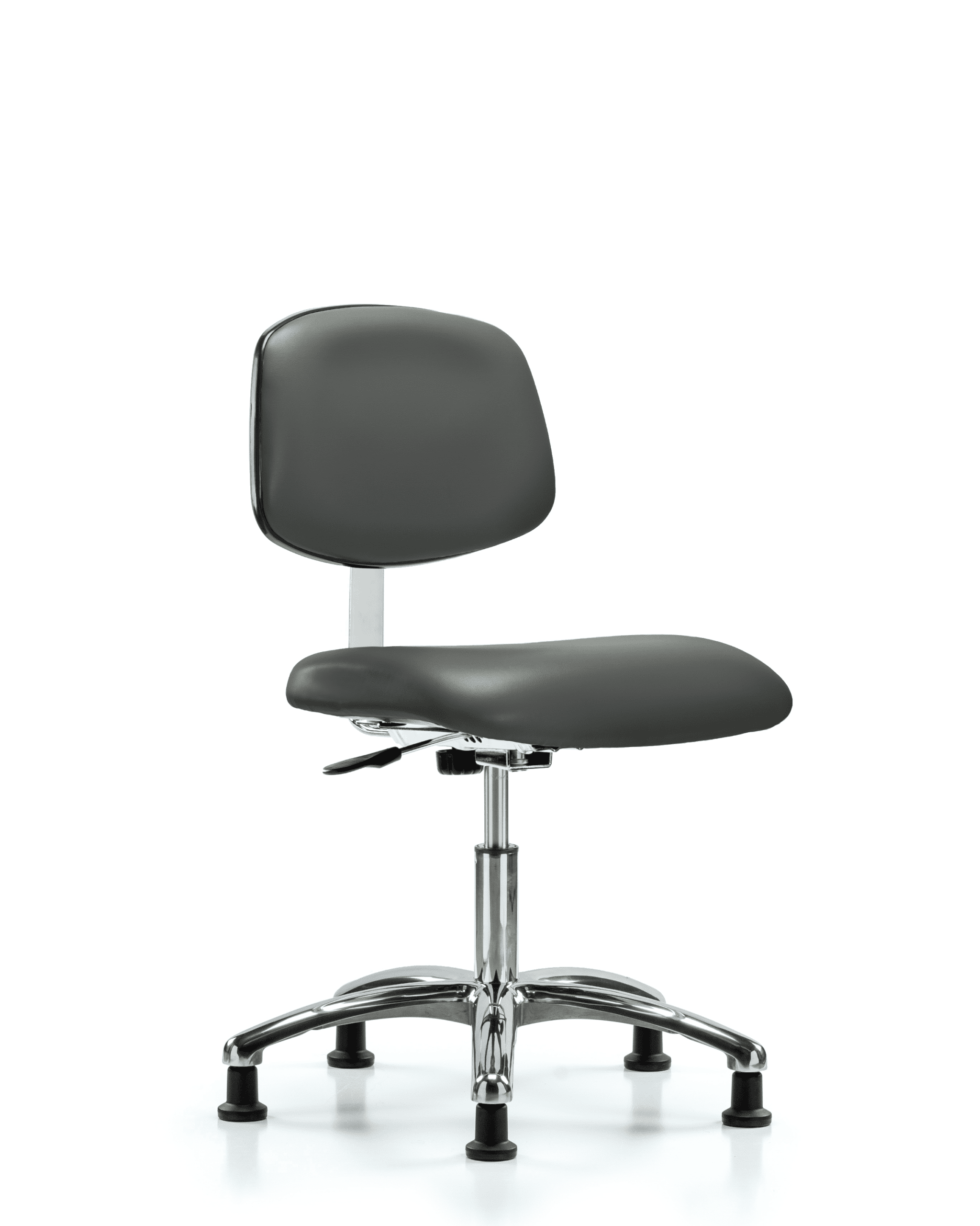 Description : Class 10 Clean Room Vinyl Desk Height Chair in Chrome is adjustable from 18.5-23.75 inches from the top of the seat to the floor and features manual back height and depth adjustments and cast-aluminum base with stationary, non-marring glides suitable for hard floors in antibacterial/antifungal Carbon Supernova vinyl.