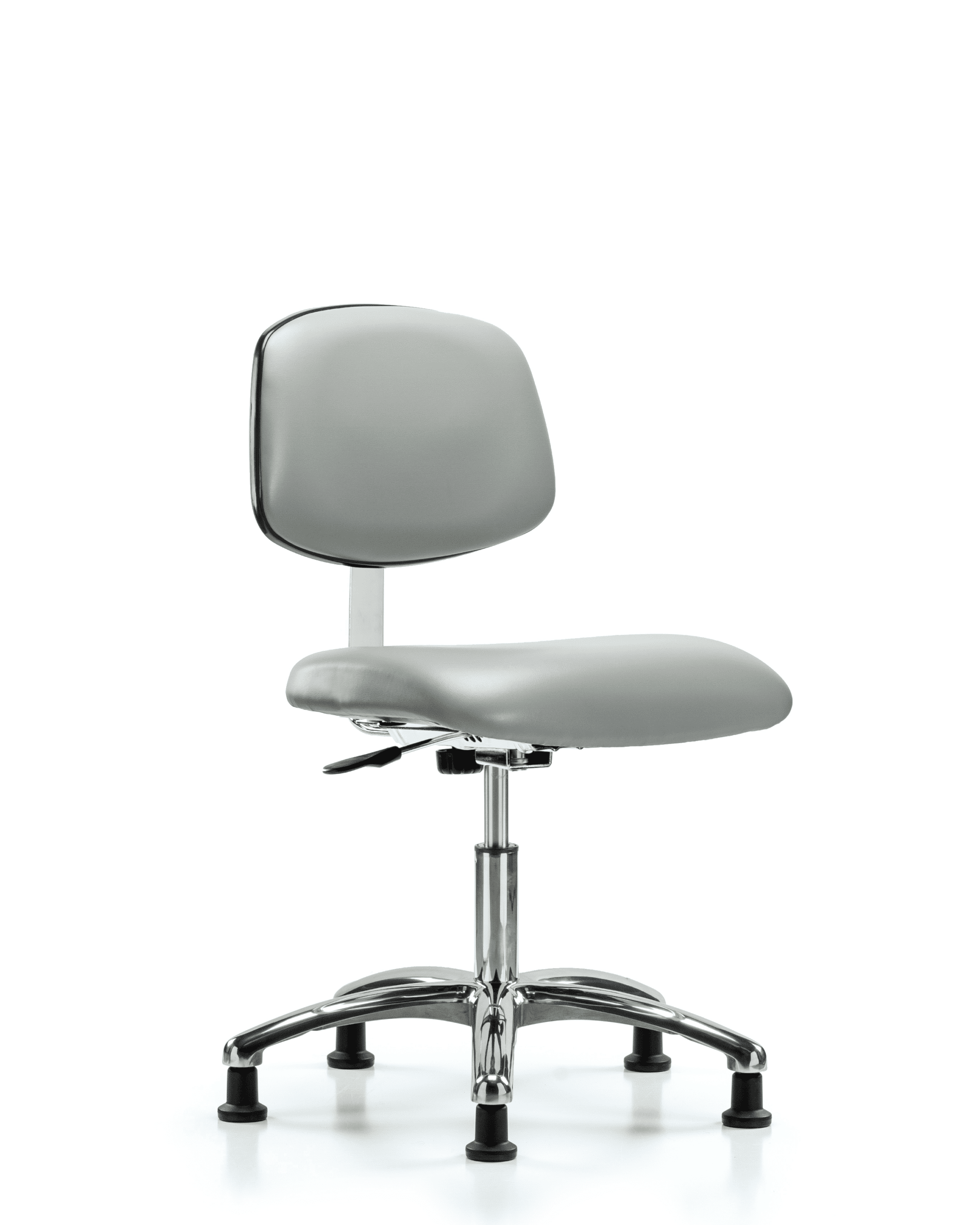 Description : Class 10 Clean Room Vinyl Desk Height Chair in Chrome is adjustable from 18.5-23.75 inches from the top of the seat to the floor and features manual back height and depth adjustments and cast-aluminum base with stationary, non-marring glides suitable for hard floors in antifungal/antibacterial Dove Trailblazer vinyl.