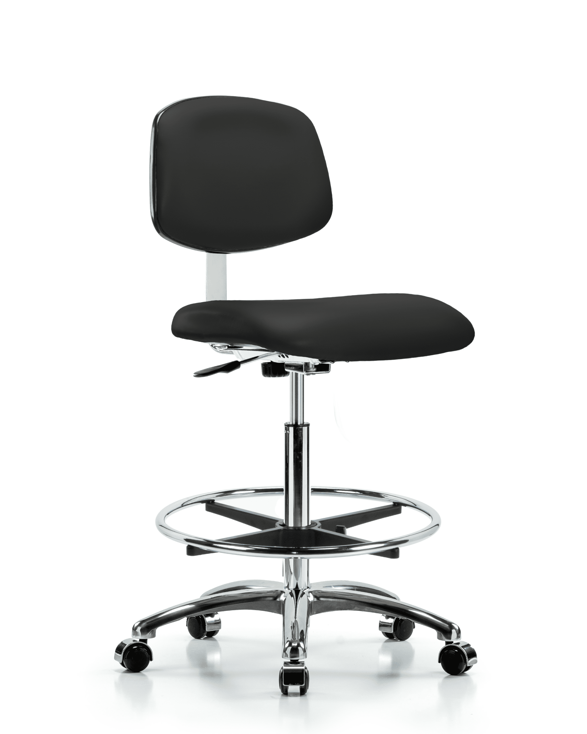 Description : Class 10 Clean Room Vinyl High Bench Height Chair in Chrome is adjustable from 25.75-35.5 inches from the top of the seat to the floor and features manual back height and depth adjustments, chrome adjustable foot ring, and cast-aluminum base with chrome-hooded, dual-wheel, self-braking, non-marring casters suitable for hard floors in antifungal/antibacterial Black Trailblazer vinyl.