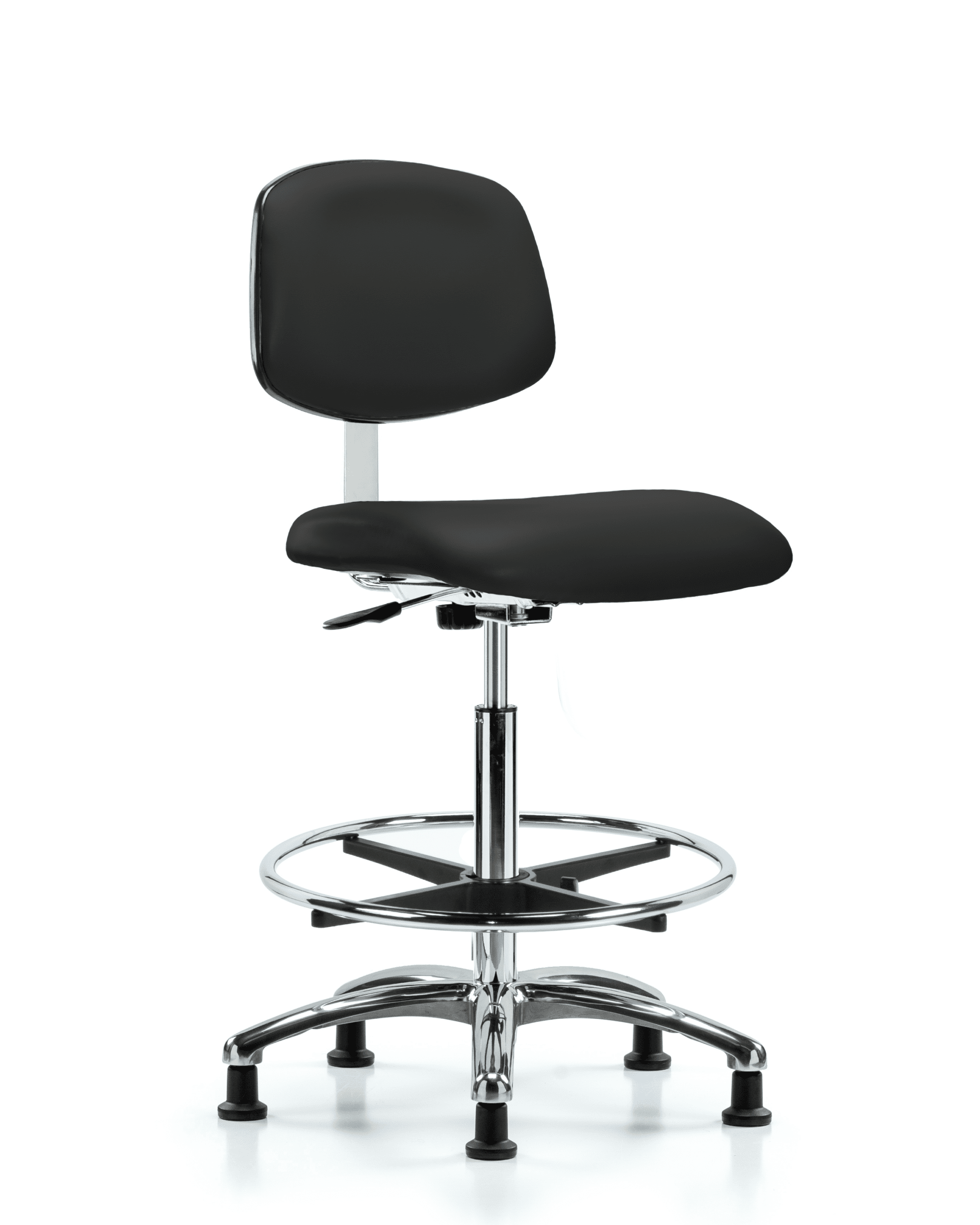 Class 10 Clean Room Vinyl Chair Chrome – High Bench Height with Chrome Foot Ring & Stationary Glides in Black Trailblazer Vinyl