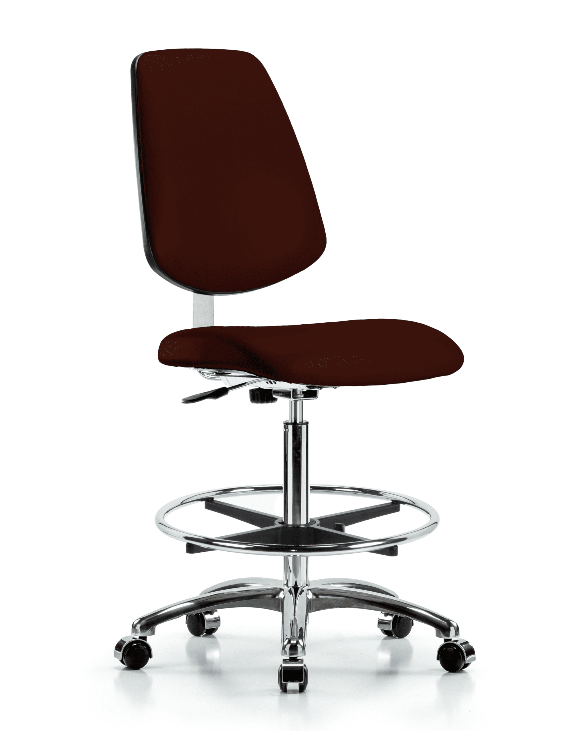 Class 10 Clean Room Vinyl Chair Chrome – High Bench Height with Medium Back, Chrome Foot Ring, & Casters in Burgundy Trailblazer Vinyl