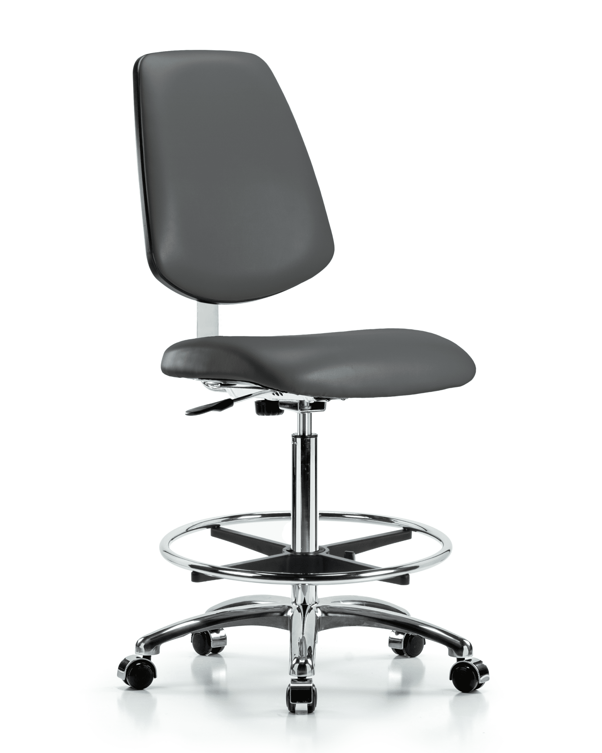 Class 10 Clean Room Vinyl Chair Chrome – High Bench Height with Medium Back, Chrome Foot Ring, & Casters in Carbon Supernova Vinyl