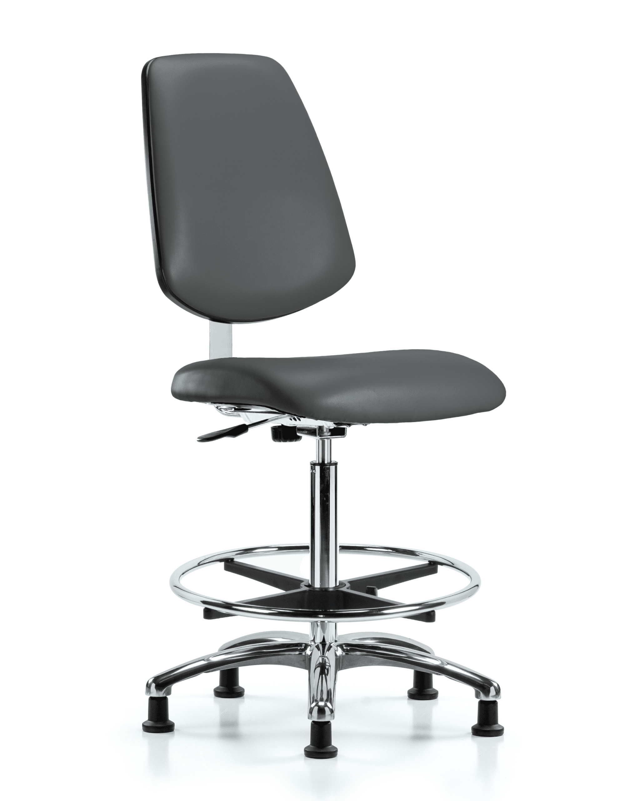 Class 10 Clean Room Vinyl Chair Chrome – High Bench Height with Medium Back, Chrome Foot Ring, & Stationary Glides in Carbon Supernova Vinyl