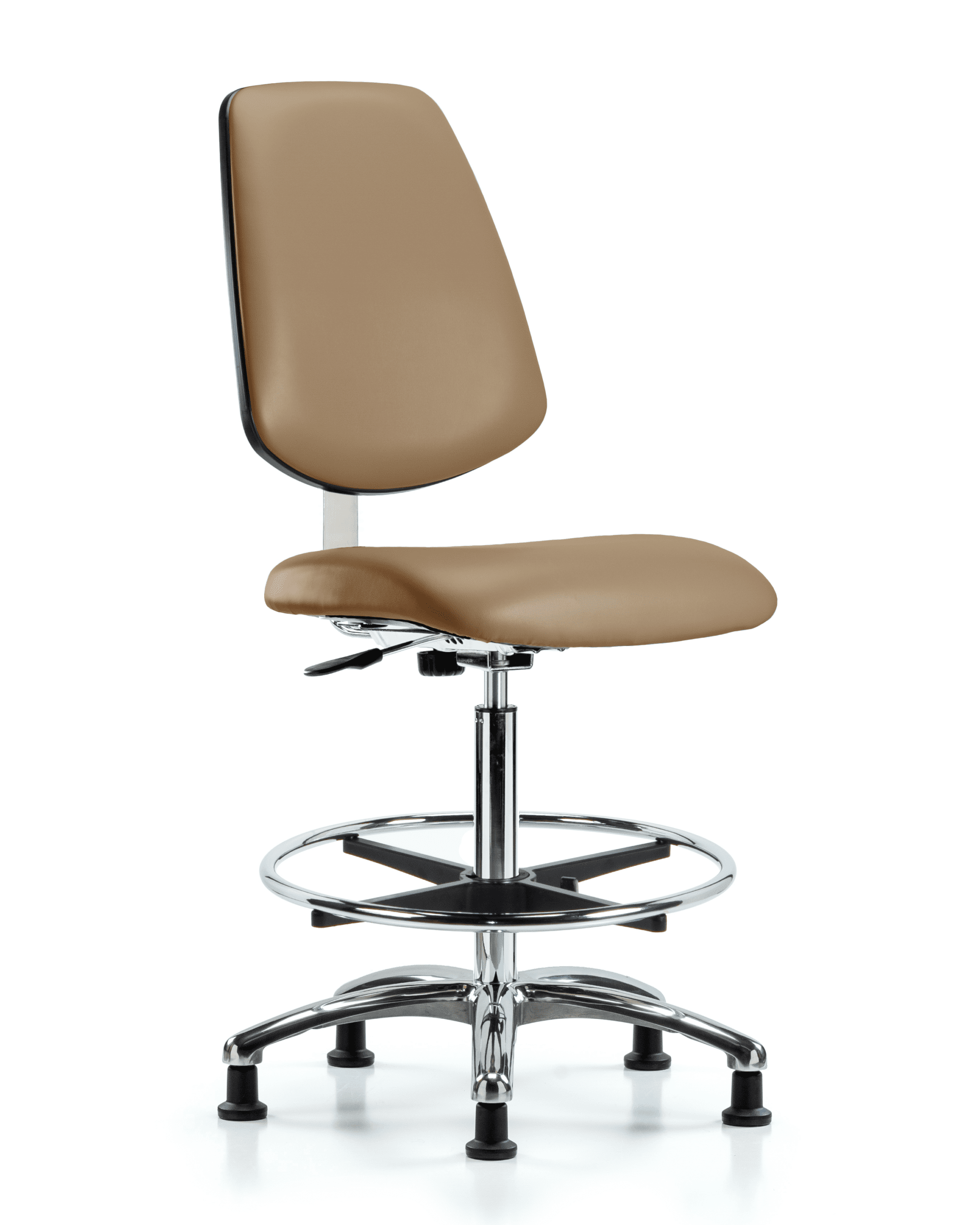 Class 10 Clean Room Vinyl Chair Chrome – High Bench Height with Medium Back, Chrome Foot Ring, & Stationary Glides in Taupe Trailblazer Vinyl