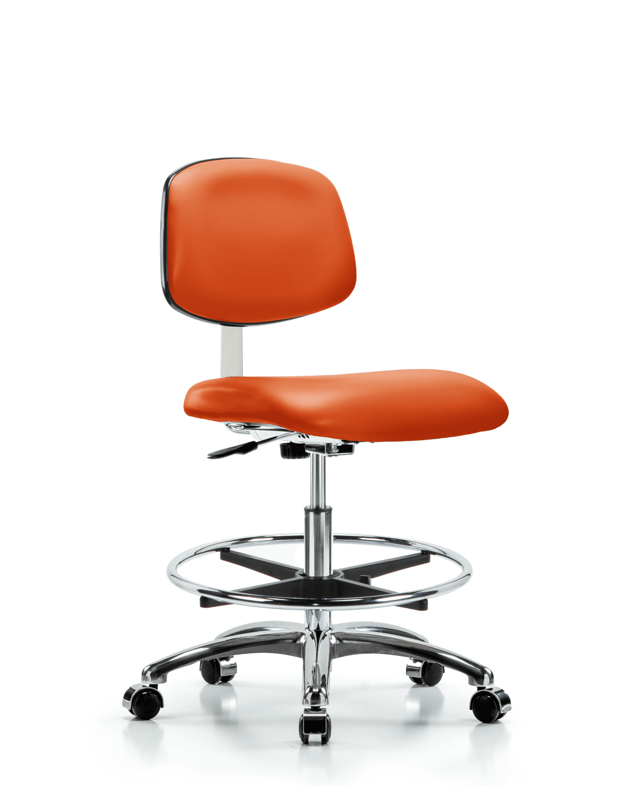 Class 10 Clean Room Vinyl Chair Chrome – Medium Bench Height with Chrome Foot Ring & Casters in Orange Kist Trailblazer Vinyl
