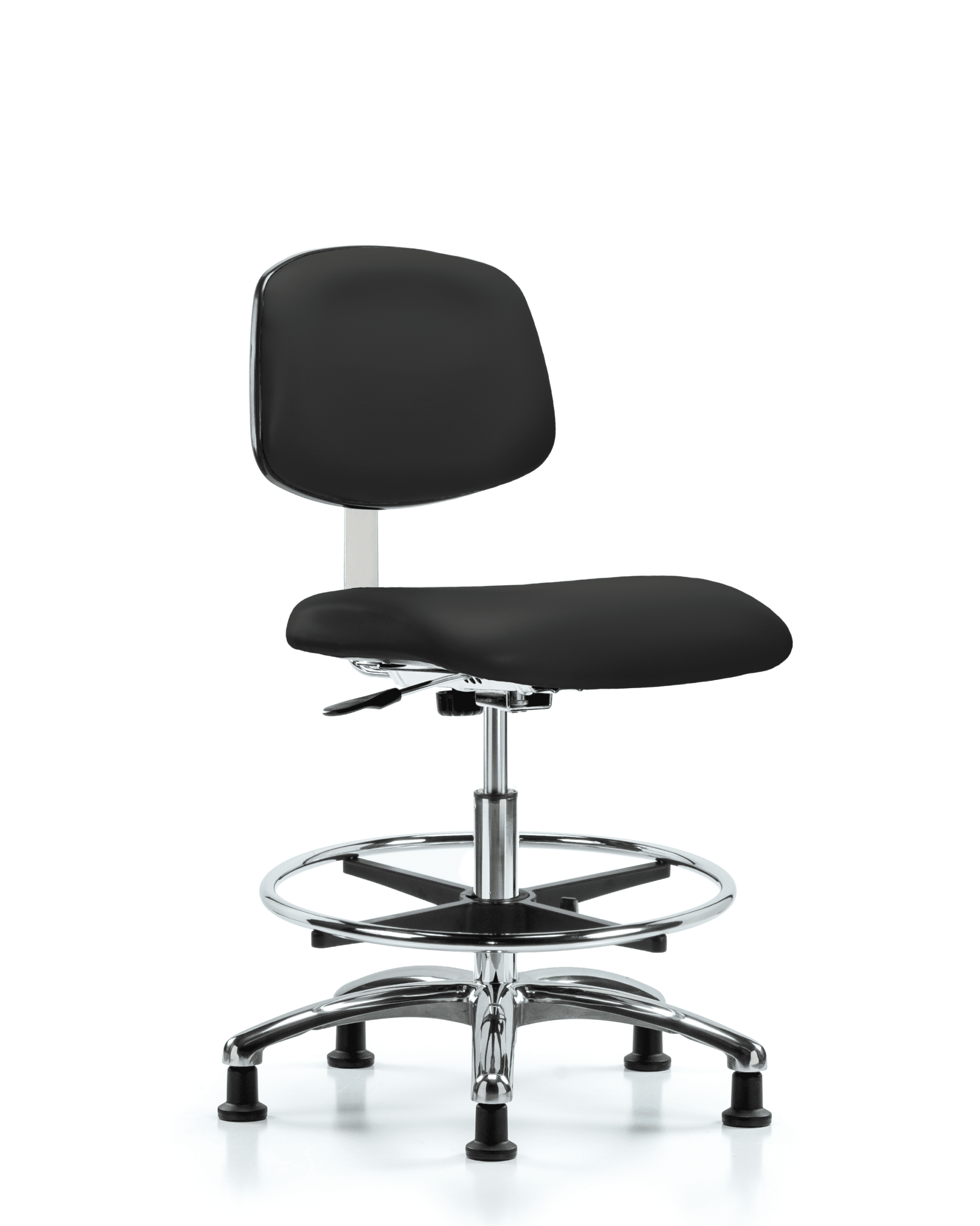 Class 10 Clean Room Vinyl Chair Chrome – Medium Bench Height with Chrome Foot Ring & Stationary Glides in Black Trailblazer Vinyl