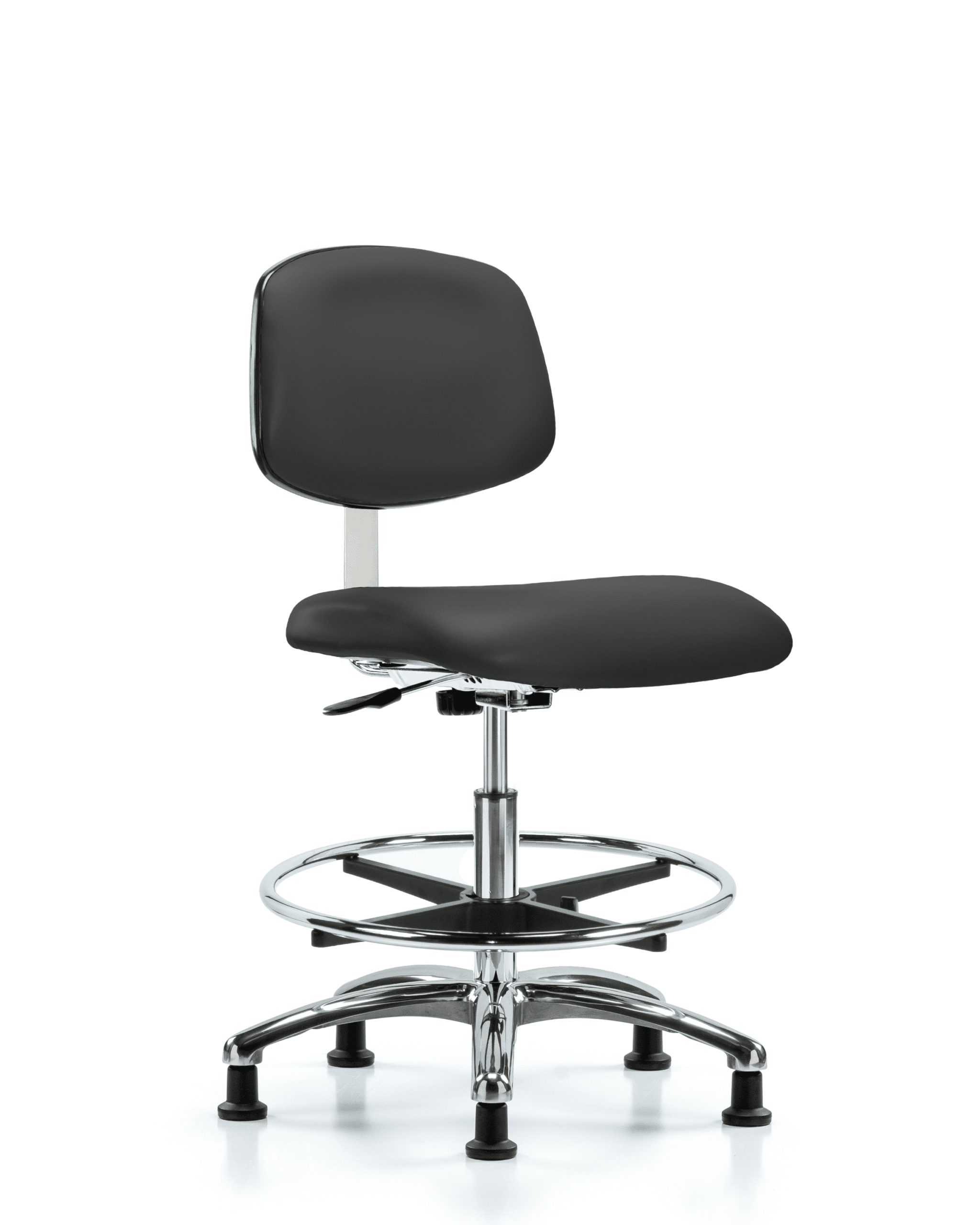 Description : Class 10 Clean Room Vinyl Medium Bench Height Chair in Chrome is adjustable from 21.5-29 inches from the top of the seat to the floor and features manual back height and depth adjustments, chrome adjustable foot ring, and cast-aluminum base with stationary, non-marring glides suitable for hard floors in antifungal/antibacterial Charcoal Trailblazer vinyl.