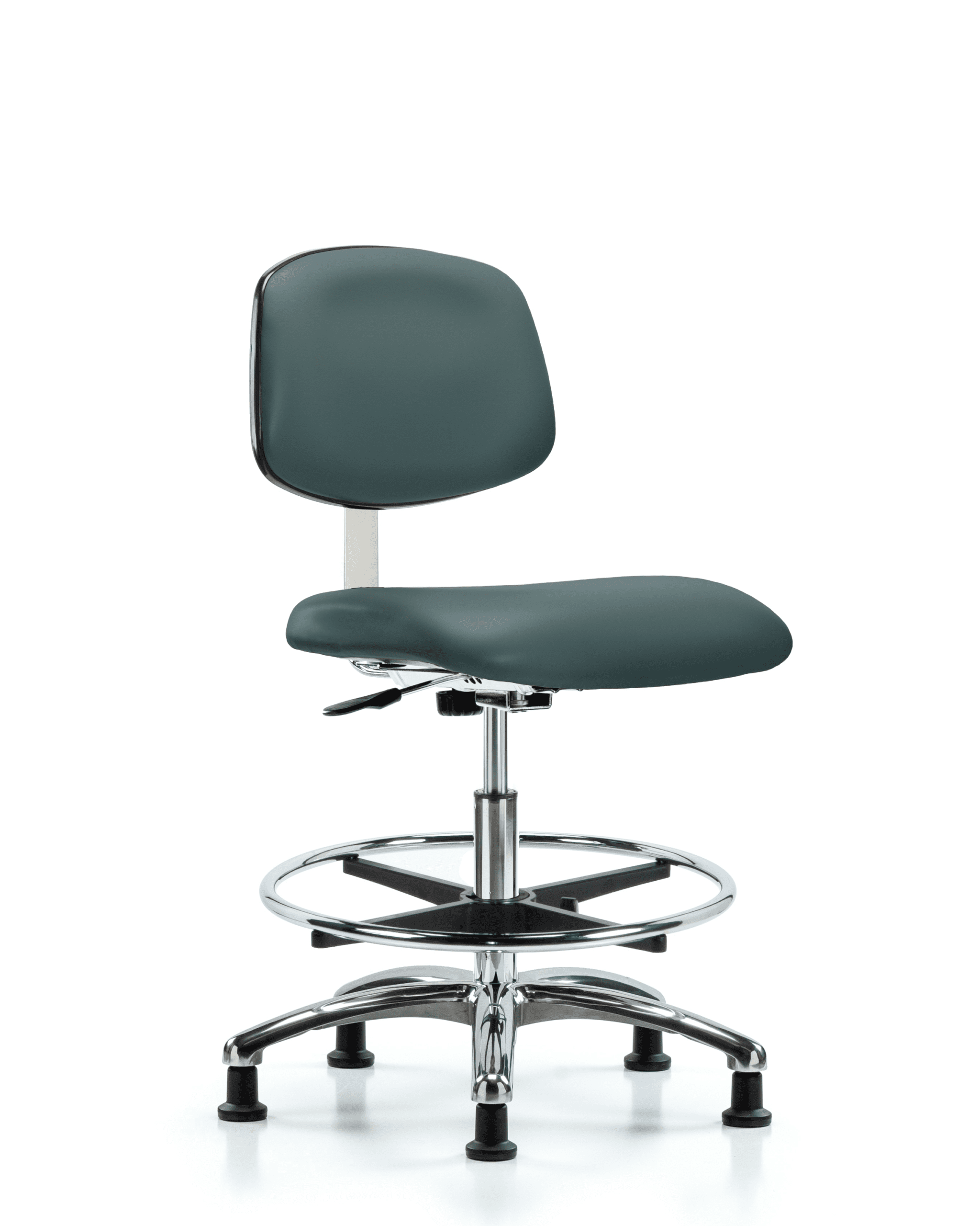 Description : Class 10 Clean Room Vinyl Medium Bench Height Chair in Chrome is adjustable from 21.5-29 inches from the top of the seat to the floor and features manual back height and depth adjustments, chrome adjustable foot ring, and cast-aluminum base with stationary, non-marring glides suitable for hard floors in antifungal/antibacterial Colonial Blue Trailblazer vinyl.