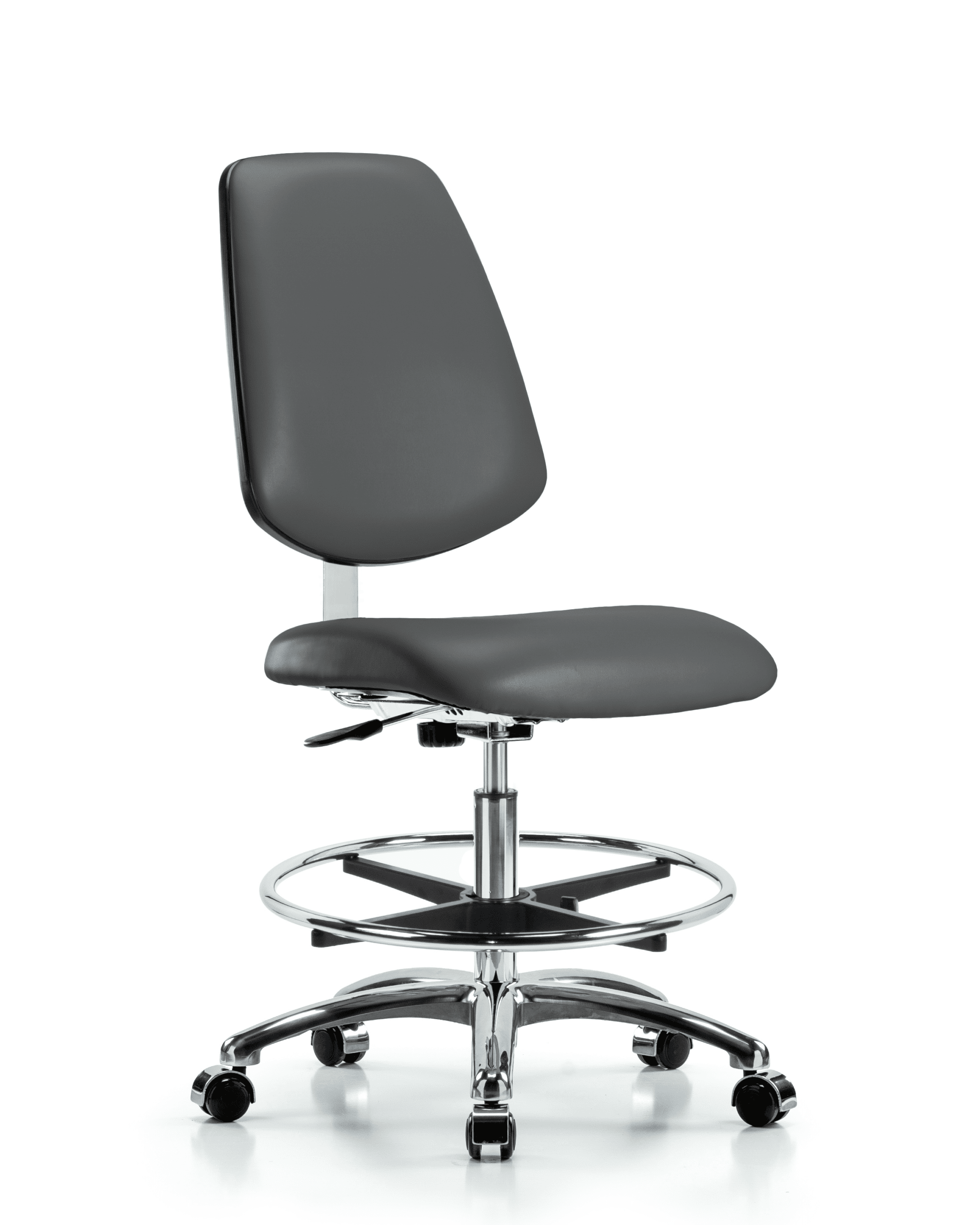 Class 10 Clean Room Vinyl Chair Chrome – Medium Bench Height with Medium Back, Chrome Foot Ring, & Casters in Carbon Supernova Vinyl