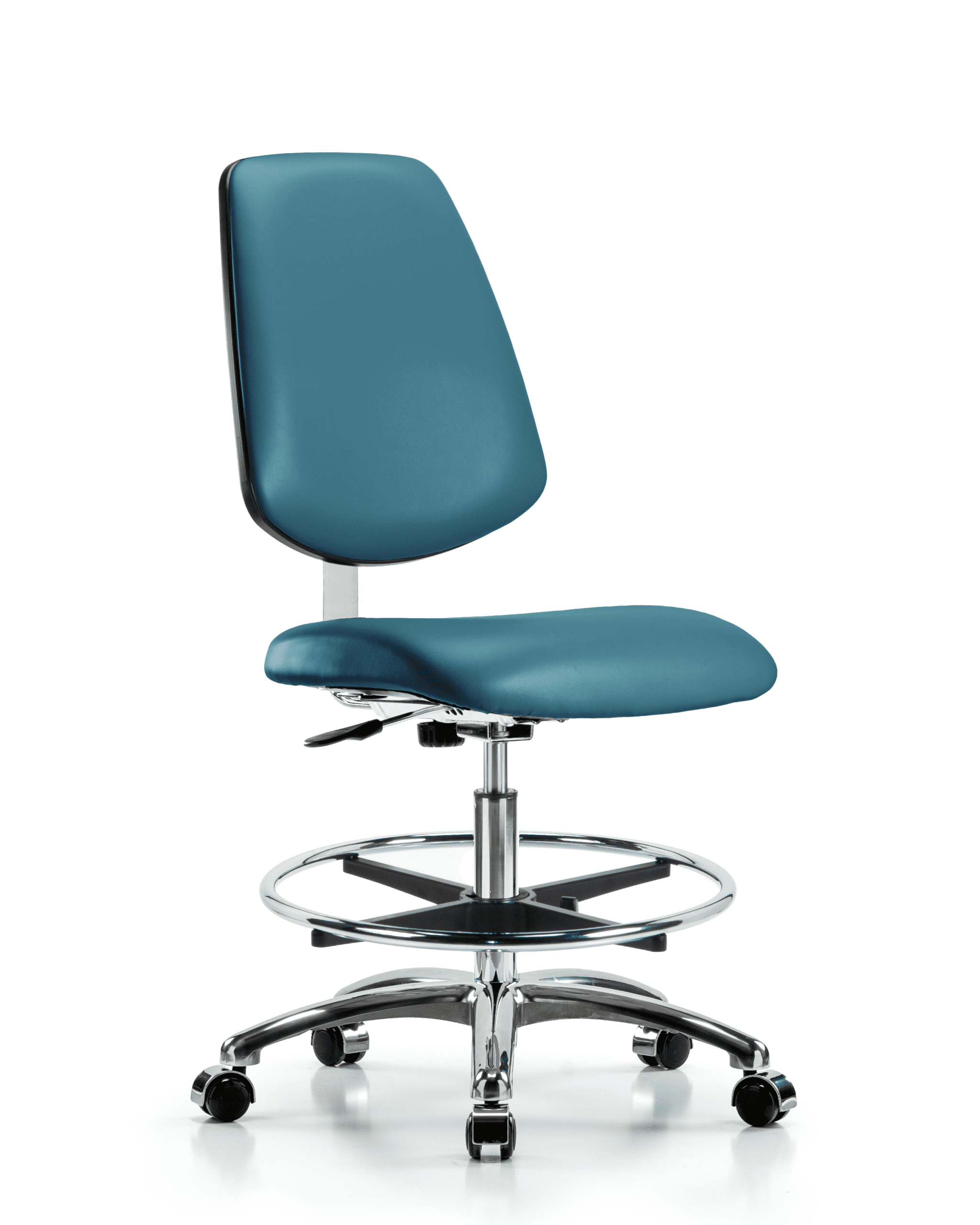 Class 10 Clean Room Vinyl Chair Chrome – Medium Bench Height with Medium Back, Chrome Foot Ring, & Casters in Marine Blue Supernova Vinyl