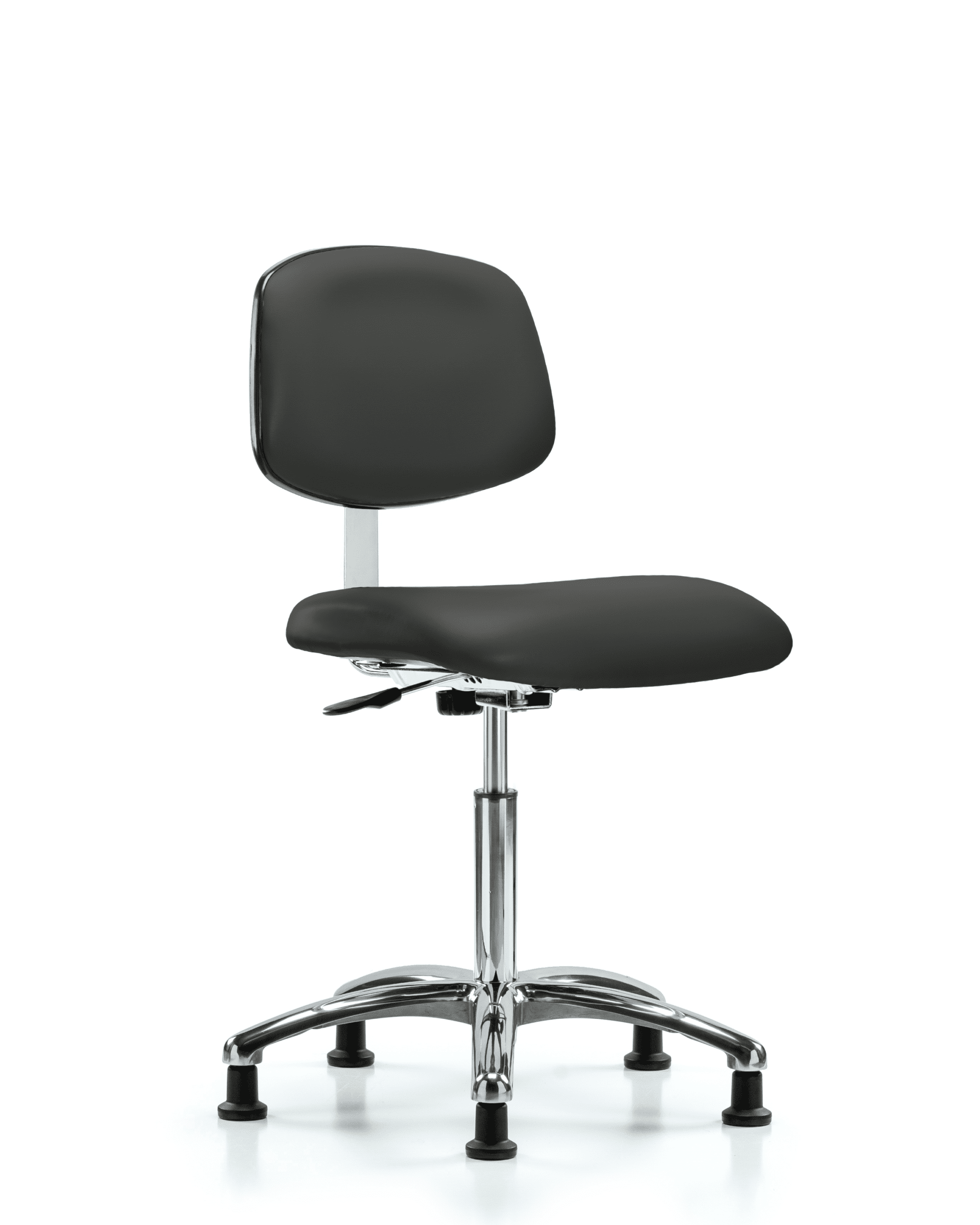 Description : Class 10 Clean Room Vinyl Medium Bench Height Chair in Chrome is adjustable from 21.5-29 inches from the top of the seat to the floor and features manual back height and depth adjustments and cast-aluminum base with stationary, non-marring glides suitable for hard floors in antifungal/antibacterial Charcoal Trailblazer vinyl.