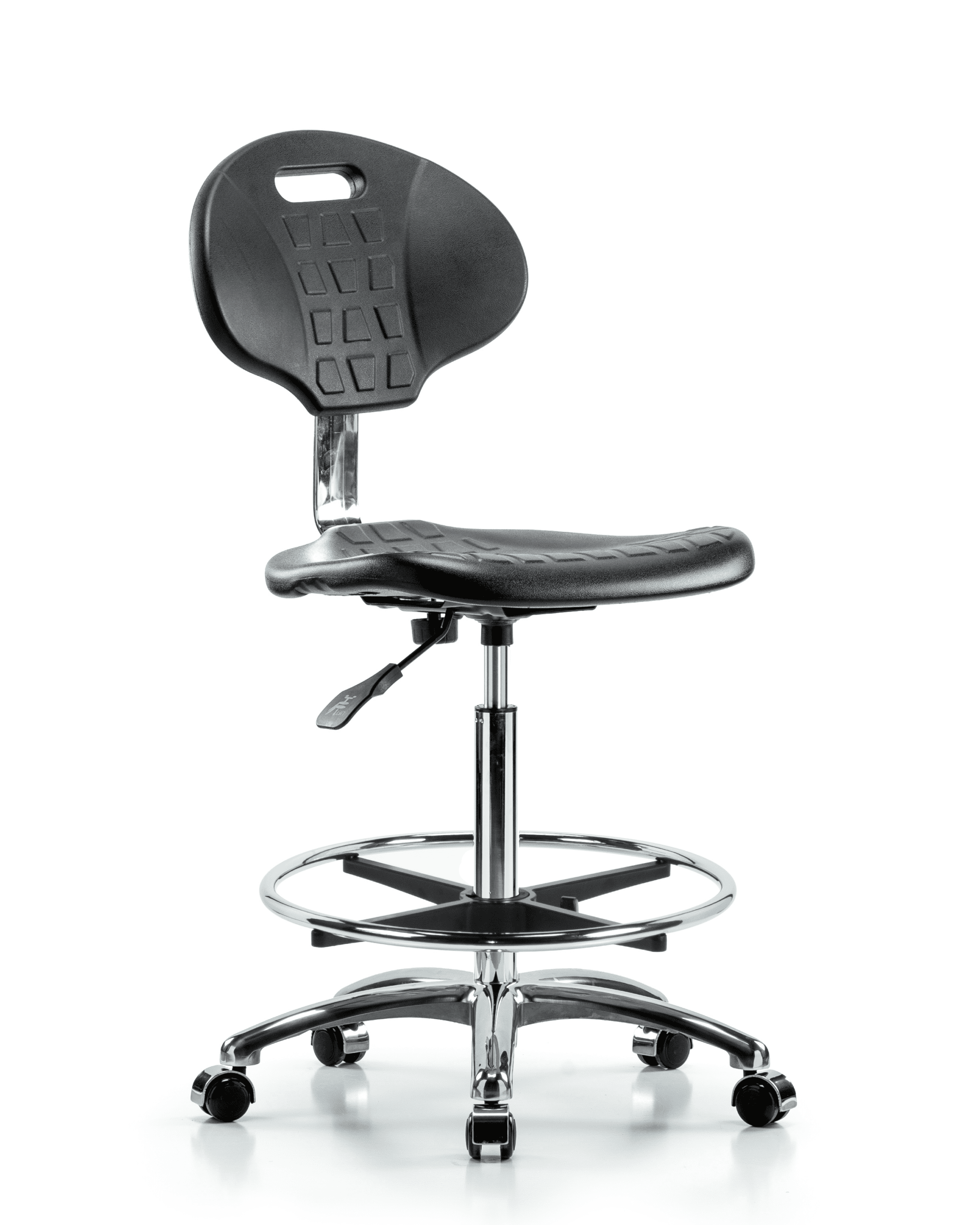 Description : Class 10 Clean Room Core Industrial Black Polyurethane High Bench Height Chair in Chrome is adjustable from 23.5-33.5 inches from the top of the seat to the floor and features manual back height and back depth adjustments, built in handle for ease of movement, chrome adjustable foot ring, and cast-aluminum base with chrome-hooded, dual-wheel, self-braking, non-marring casters suitable for hard floors in chemical, soil, and puncture resistant polyurethane.