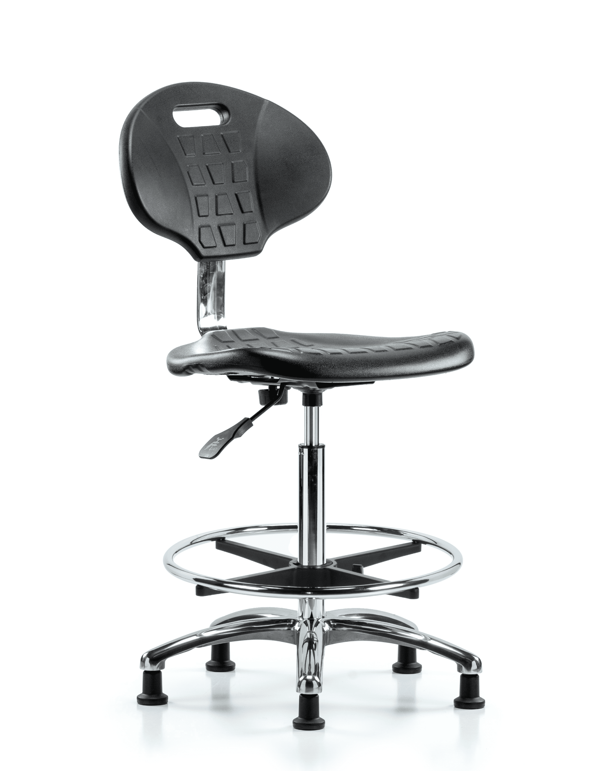 Description : Class 10 Clean Room Core Industrial Black Polyurethane High Bench Height Chair in Chrome is adjustable from 23.5-33.5 inches from the top of the seat to the floor and features manual back height and back depth adjustments, built in handle for ease of movement, chrome adjustable foot ring, and cast-aluminum base with stationary, non-marring glides suitable for hard floors in chemical, soil, and puncture resistant polyurethane.