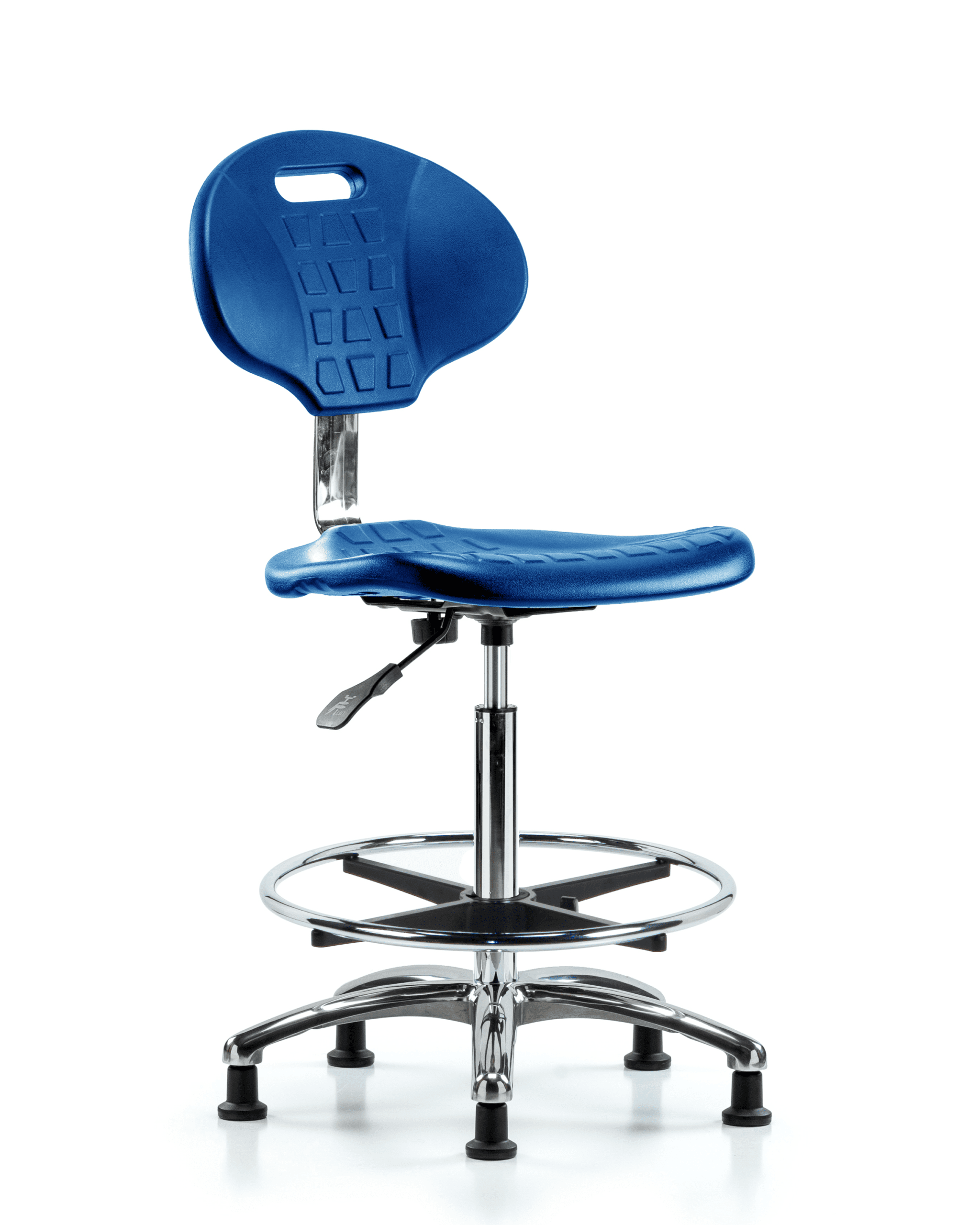 Description : Class 10 Clean Room Core Industrial Blue Polyurethane High Bench Height Chair in Chrome is adjustable from 23.5-33.5 inches from the top of the seat to the floor and features manual back height and back depth adjustments, built in handle for ease of movement, chrome adjustable foot ring, and cast-aluminum base with stationary, non-marring glides suitable for hard floors in chemical, soil, and puncture resistant polyurethane.