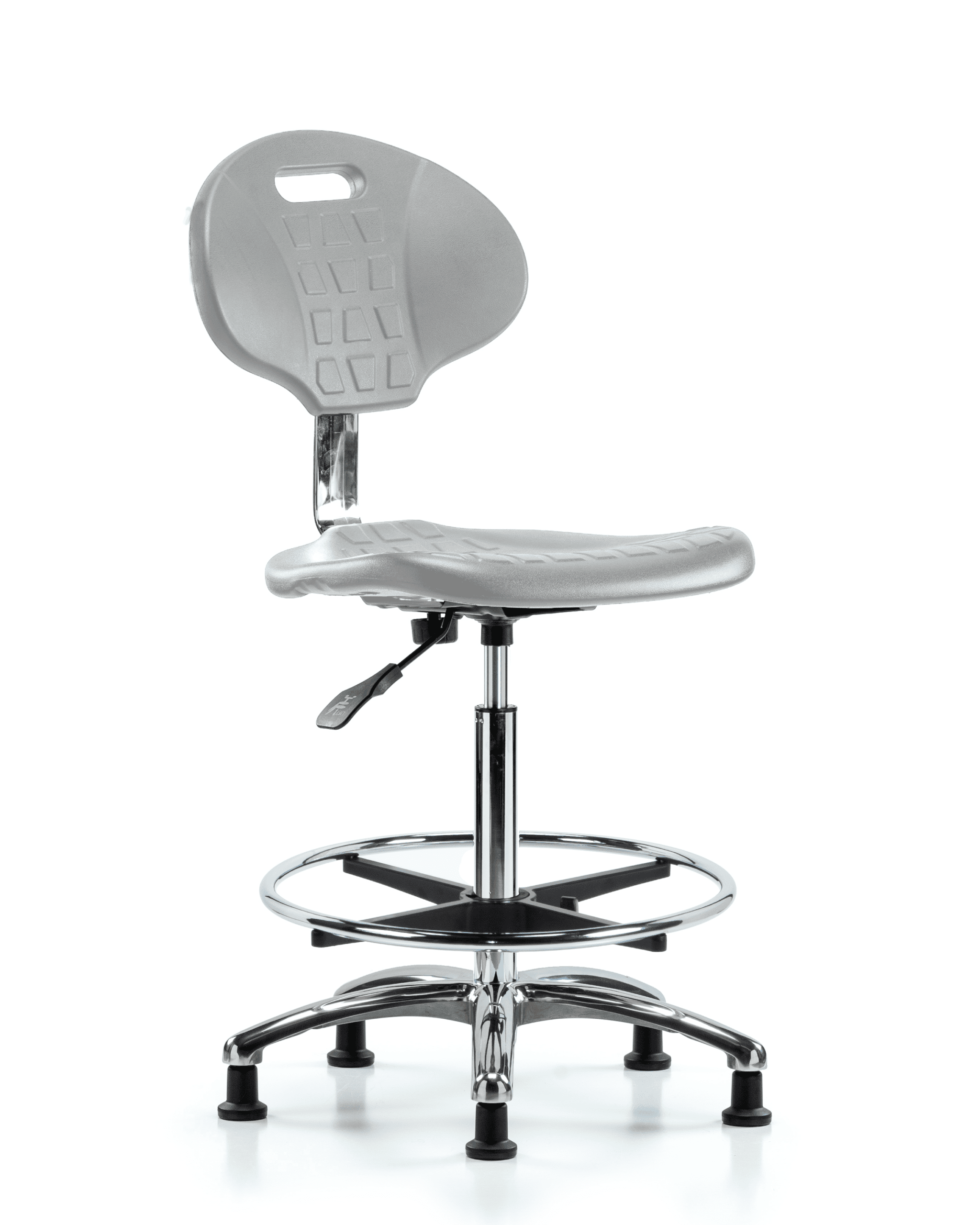 Description : Class 10 Clean Room Core Industrial Gray Polyurethane High Bench Height Chair in Chrome is adjustable from 23.5-33.5 inches from the top of the seat to the floor and features manual back height and back depth adjustments, built in handle for ease of movement, chrome adjustable foot ring, and cast-aluminum base with stationary, non-marring glides suitable for hard floors in chemical, soil, and puncture resistant polyurethane.
