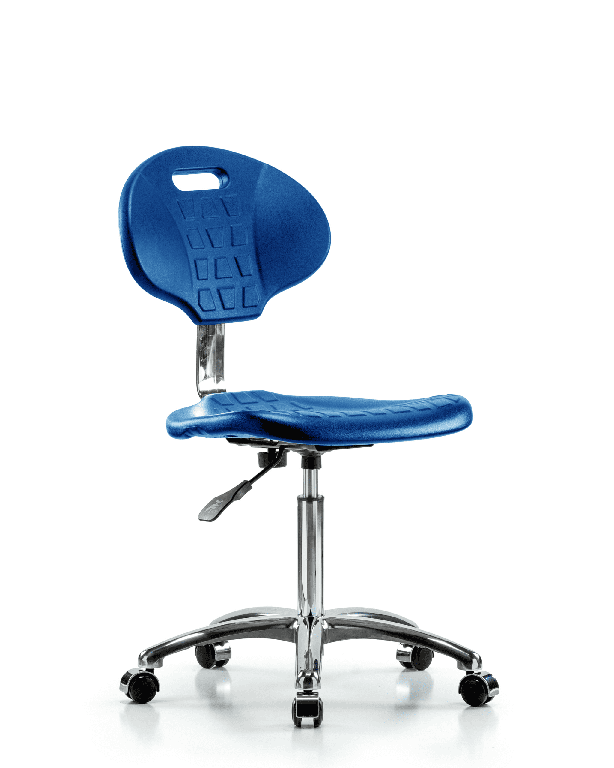 Description : Class 10 Clean Room Core Industrial Blue Polyurethane Medium Bench Height Chair in Chrome is adjustable from 19.5-27 inches from the top of the seat to the floor and features manual back height and back depth adjustments, built in handle for ease of movement, and cast-aluminum base with chrome-hooded, dual-wheel, self-braking, non-marring casters suitable for hard floors in chemical, soil, and puncture resistant polyurethane.