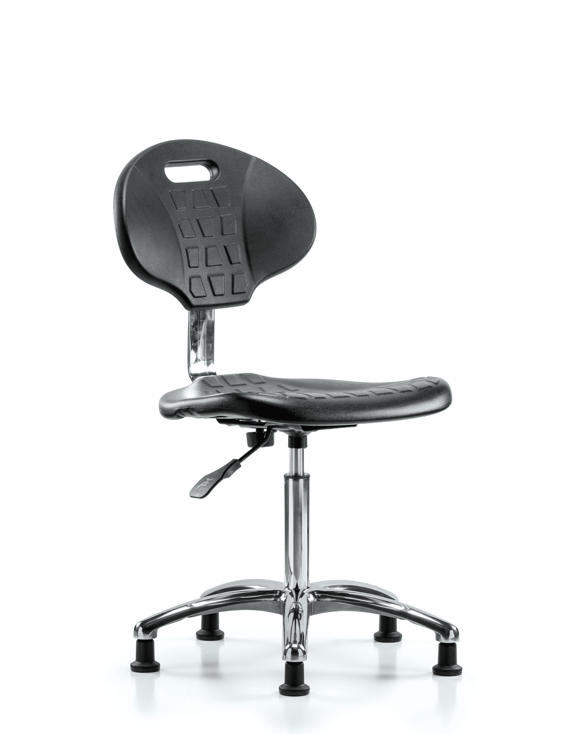 Description : Class 10 Clean Room Core Industrial Black Polyurethane Medium Bench Height Chair in Chrome is adjustable from 19.5-27 inches from the top of the seat to the floor and features manual back height and back depth adjustments, built in handle for ease of movement, and cast-aluminum base with stationary, non-marring glides suitable for hard floors in chemical, soil, and puncture resistant polyurethane.
