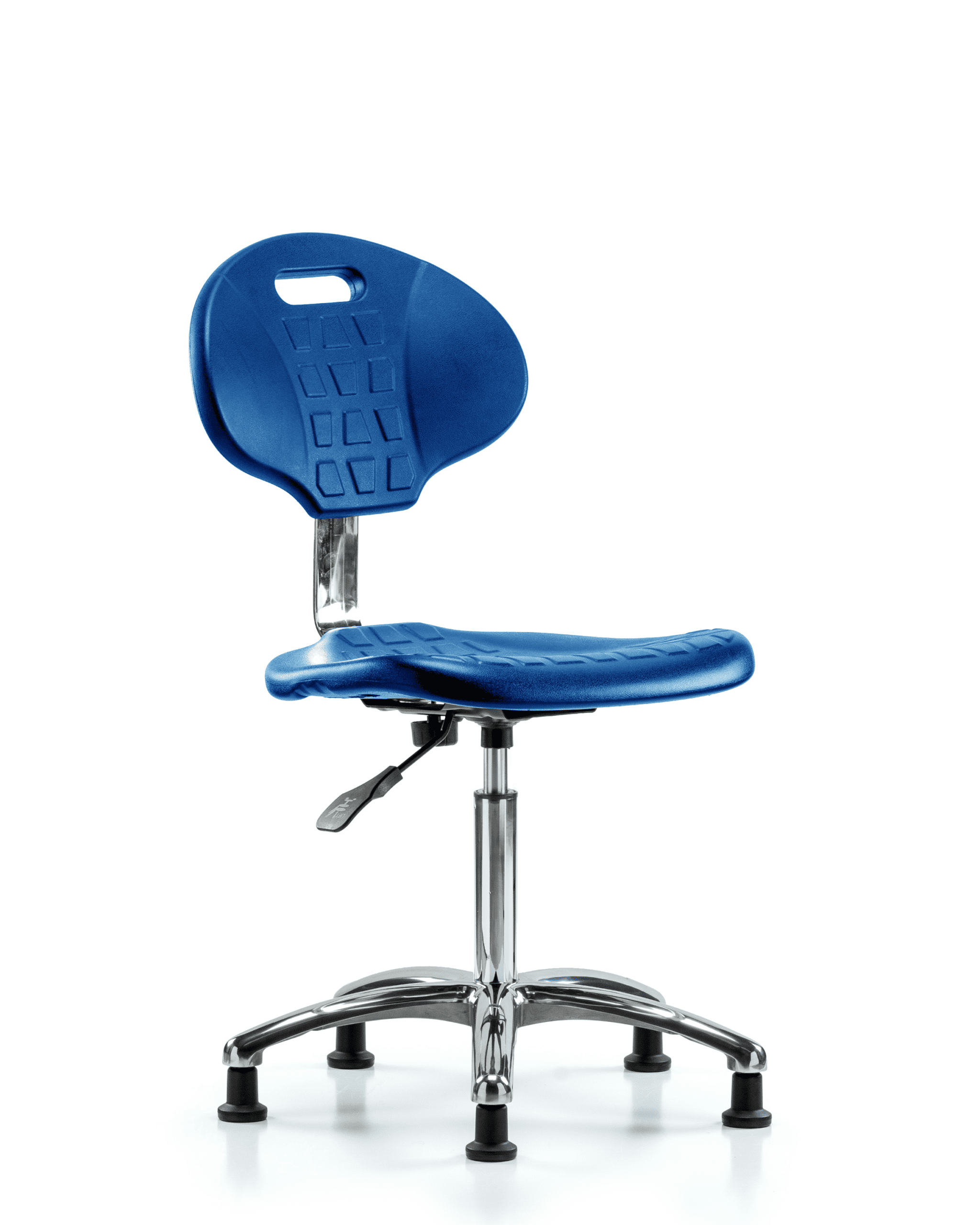 Description : Class 10 Clean Room Core Industrial Blue Polyurethane Medium Bench Height Chair in Chrome is adjustable from 19.5-27 inches from the top of the seat to the floor and features manual back height and back depth adjustments, built in handle for ease of movement, and cast-aluminum base with stationary, non-marring glides suitable for hard floors in chemical, soil, and puncture resistant polyurethane.