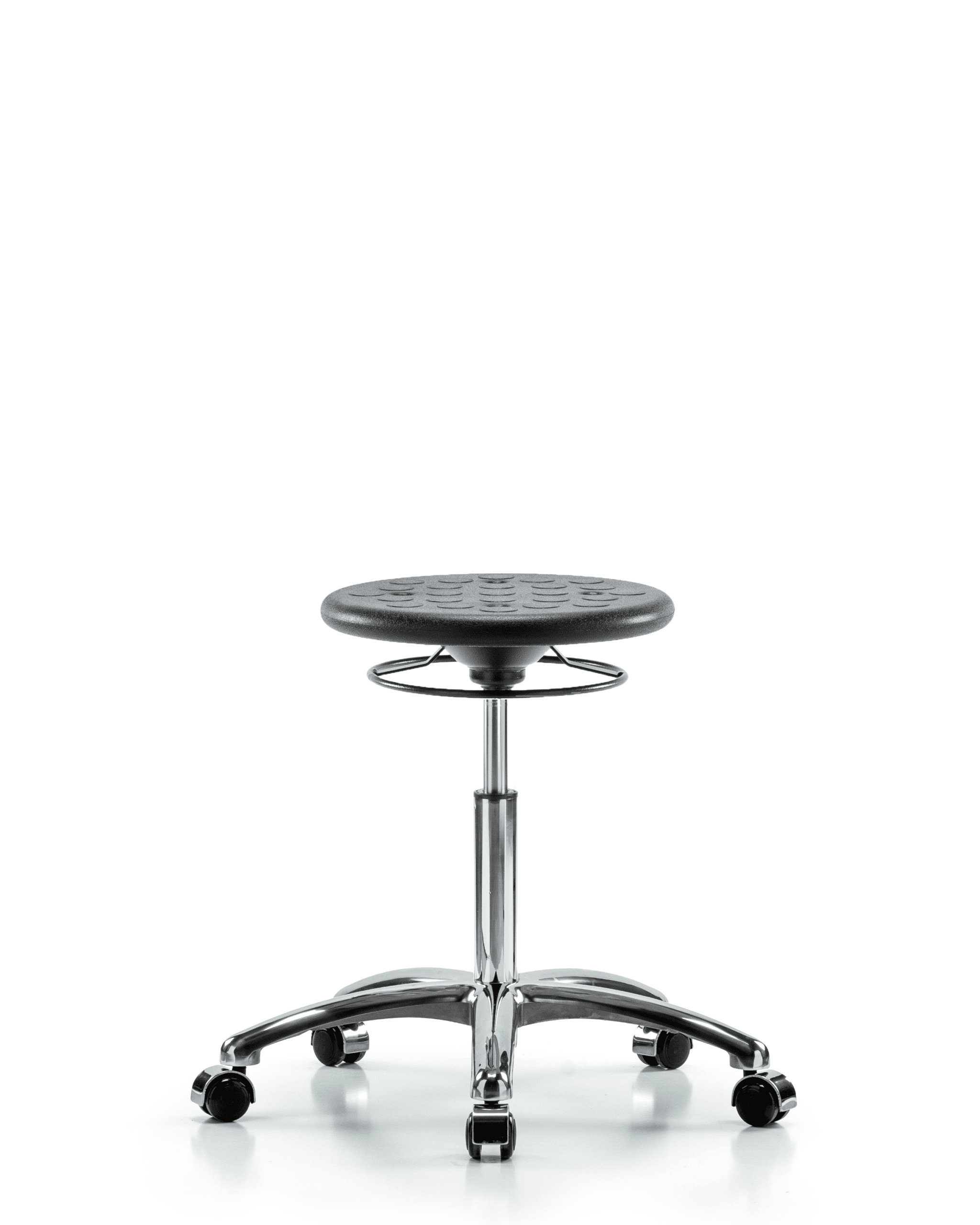 Description : Class 10 Clean Room Industrial Black Polyurethane Medium Bench Height Stool in Chrome is adjustable from 19.25-27 inches from the top of the seat to the floor and features 360-degree, all-around control and cast-aluminum base with chrome-hooded, dual-wheel, self-braking, non-marring casters suitable for hard floors in chemical, soil, and puncture resistant polyurethane.