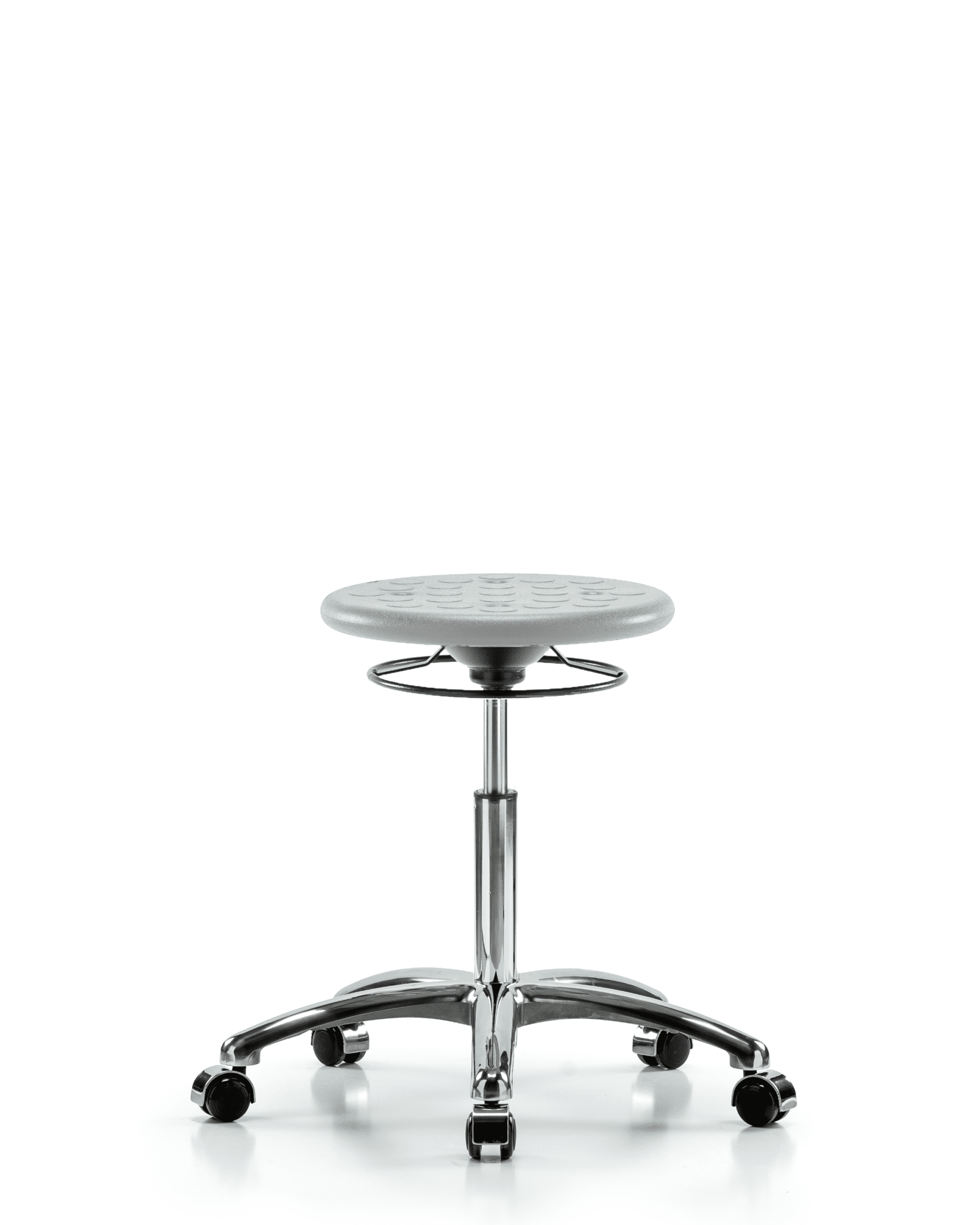 Description : Class 10 Clean Room Industrial Gray Polyurethane Medium Bench Height Stool in Chrome is adjustable from 19.25-27 inches from the top of the seat to the floor and features 360-degree, all-around control and cast-aluminum base with chrome-hooded, dual-wheel, self-braking, non-marring casters suitable for hard floors in chemical, soil, and puncture resistant polyurethane.