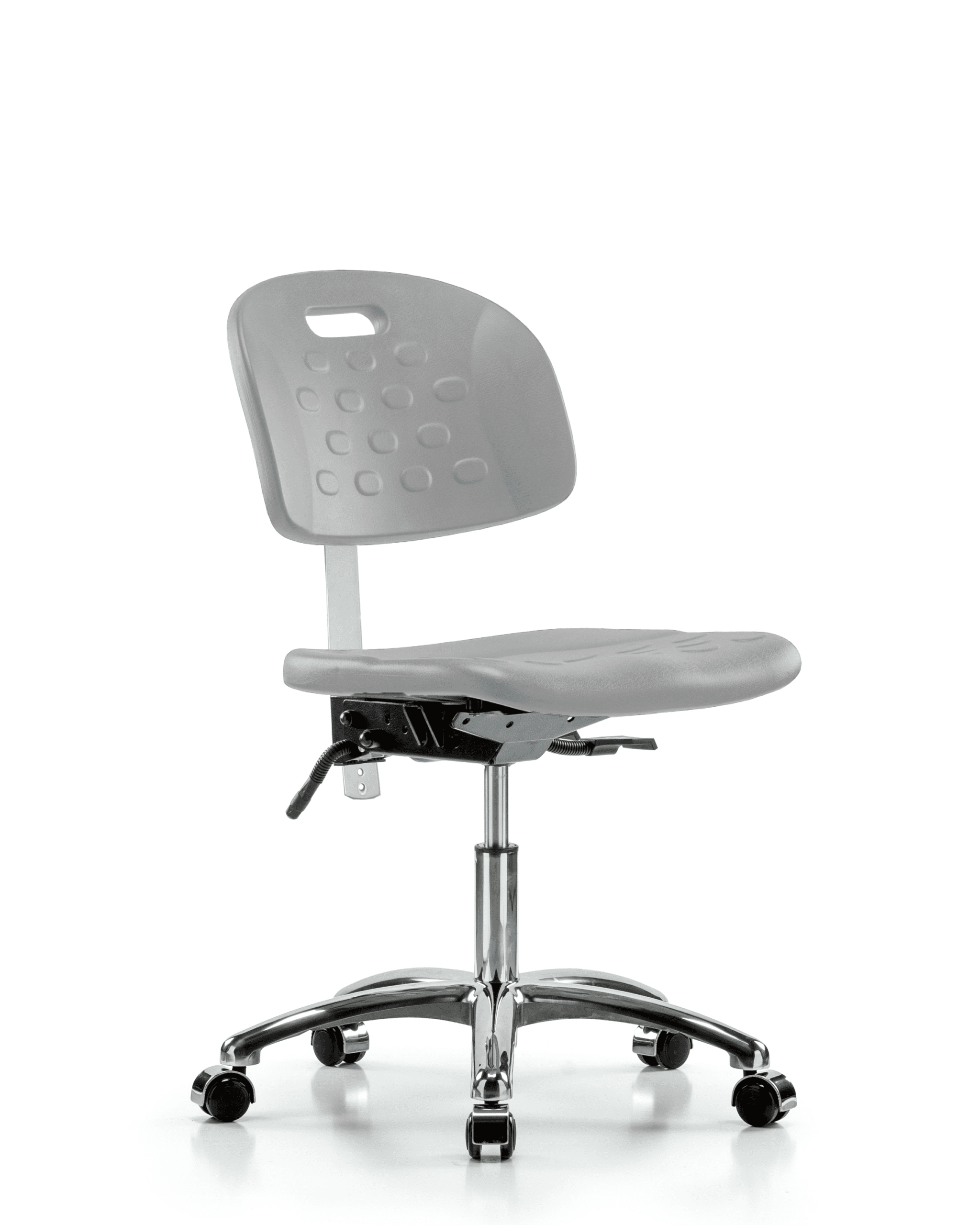 Description : Class 10 Clean Room Industrial Gray Polyurethane Desk Height Chair in Chrome is adjustable from 17.75-23 inches from the top of the seat to the floor and features ergonomic adjustments including seat height and locking back tilt, built in handle for ease of movement, and cast-aluminum base with chrome-hooded, dual-wheel, self-braking, non-marring casters suitable for hard floors in chemical, soil, and puncture resistant polyurethane.
