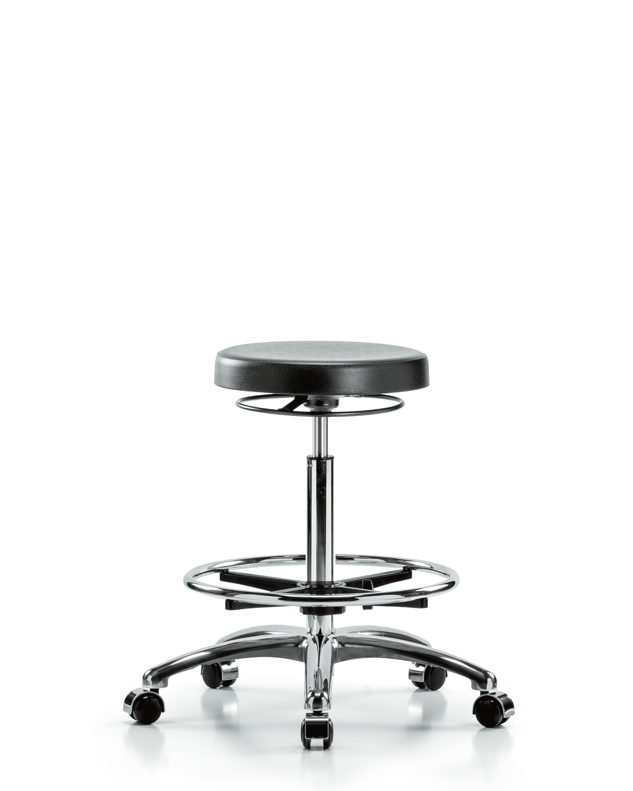 Description : Class 10 Clean Room Black Polyurethane High Bench Height Stool in Chrome is adjustable from 23.5-33.25 inches from the top of the seat to the floor and features 360-degree, all-around control, chrome adjustable foot ring, and cast-aluminum base with chrome-hooded, dual-wheel, self-braking, non-marring casters suitable for hard floors in chemical, soil, and puncture resistant polyurethane.