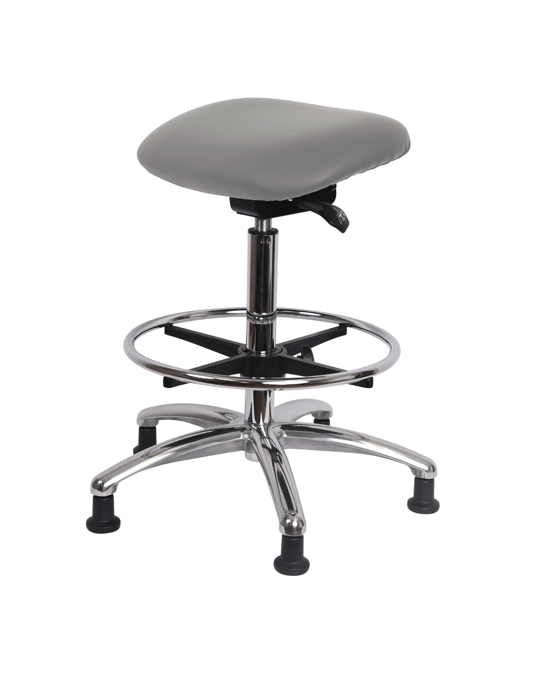 Description : Class 100 Vinyl Clean Room Sit-Stand in Chrome is adjustable from 21-31 inches from the top of the seat to the floor and features ergonomic adjustments including seat height and locking seat tilt, adjustable chrome foot ring, and cast-aluminum base with stationary, non-marring glides suitable for hard floors in Dove Trailblazer vinyl.