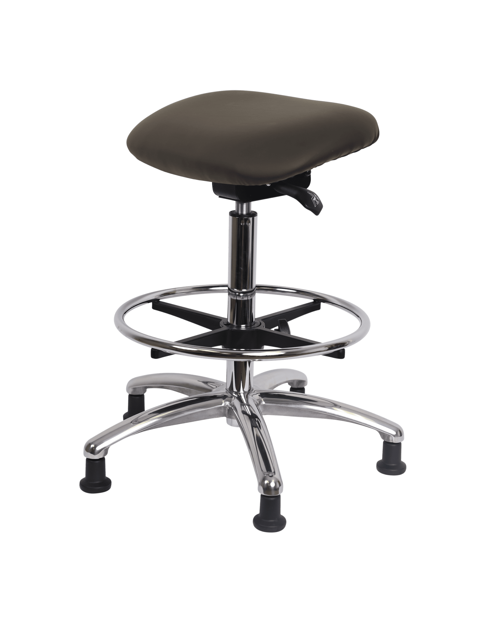 Description : Class 100 Vinyl Clean Room Sit-Stand in Chrome is adjustable from 21-31 inches from the top of the seat to the floor and features ergonomic adjustments including seat height and locking seat tilt, adjustable chrome foot ring, and cast-aluminum base with stationary, non-marring glides suitable for hard floors in Elephant Voyager vinyl.