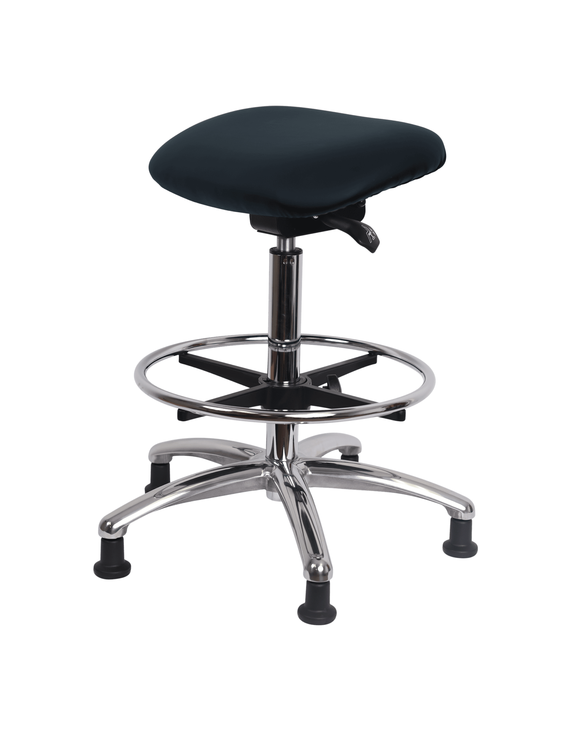 Description : Class 100 Vinyl Clean Room Sit-Stand in Chrome is adjustable from 21-31 inches from the top of the seat to the floor and features ergonomic adjustments including seat height and locking seat tilt, adjustable chrome foot ring, and cast-aluminum base with stationary, non-marring glides suitable for hard floors in Storm Supernova vinyl.