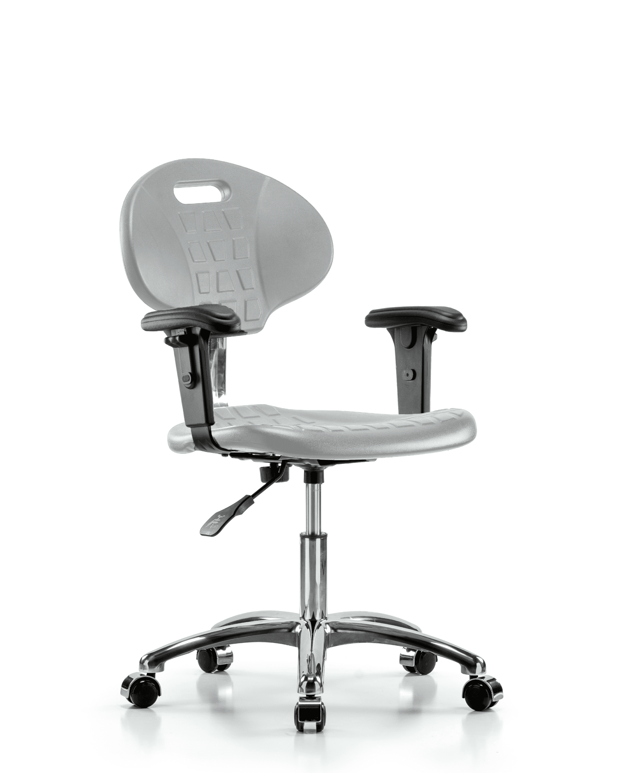 Description : Class 100 Clean Room Core Industrial Gray Polyurethane Desk Height Chair in Chrome is adjustable from 16.5-21.75 inches from the top of the seat to the floor and features manual back height and back depth adjustments, built in handle for ease of movement, 2-way adjustable arm rests, and cast-aluminum base with chrome-hooded, dual-wheel, self-braking, non-marring casters suitable for hard floors in chemical, soil, and puncture resistant polyurethane.