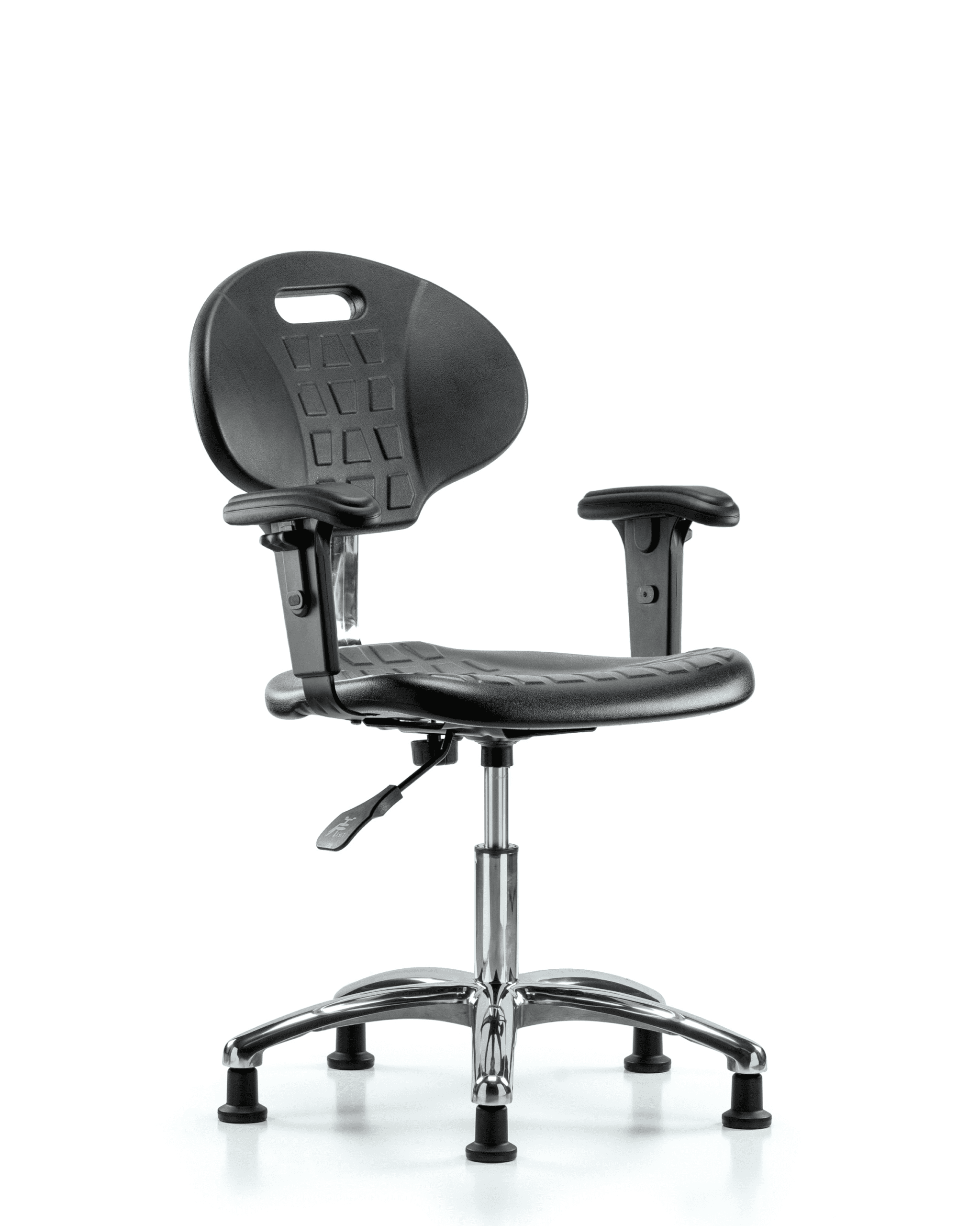 Description : Class 100 Clean Room Core Industrial Black Polyurethane Desk Height Chair in Chrome is adjustable from 16.5-21.75 inches from the top of the seat to the floor and features manual back height and back depth adjustments, built in handle for ease of movement, 2-way adjustable arm rests, and cast-aluminum base with stationary, non-marring glides suitable for hard floors in chemical, soil, and puncture resistant polyurethane.