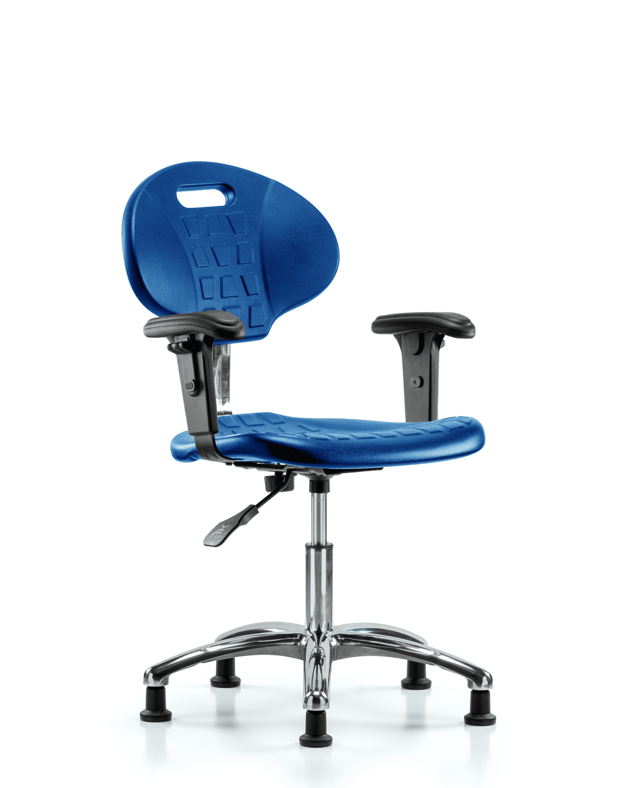 Description : Class 100 Clean Room Core Industrial Blue Polyurethane Desk Height Chair in Chrome is adjustable from 16.5-21.75 inches from the top of the seat to the floor and features manual back height and back depth adjustments, built in handle for ease of movement, 2-way adjustable arm rests, and cast-aluminum base with stationary, non-marring glides suitable for hard floors in chemical, soil, and puncture resistant polyurethane.