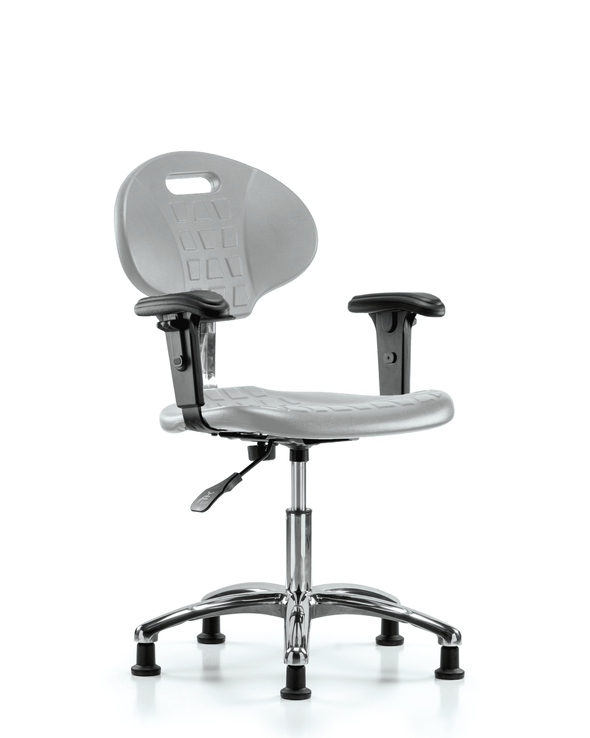 Description : Class 100 Clean Room Core Industrial Gray Polyurethane Desk Height Chair in Chrome is adjustable from 16.5-21.75 inches from the top of the seat to the floor and features manual back height and back depth adjustments, built in handle for ease of movement, 2-way adjustable arm rests, and cast-aluminum base with stationary, non-marring glides suitable for hard floors in chemical, soil, and puncture resistant polyurethane.