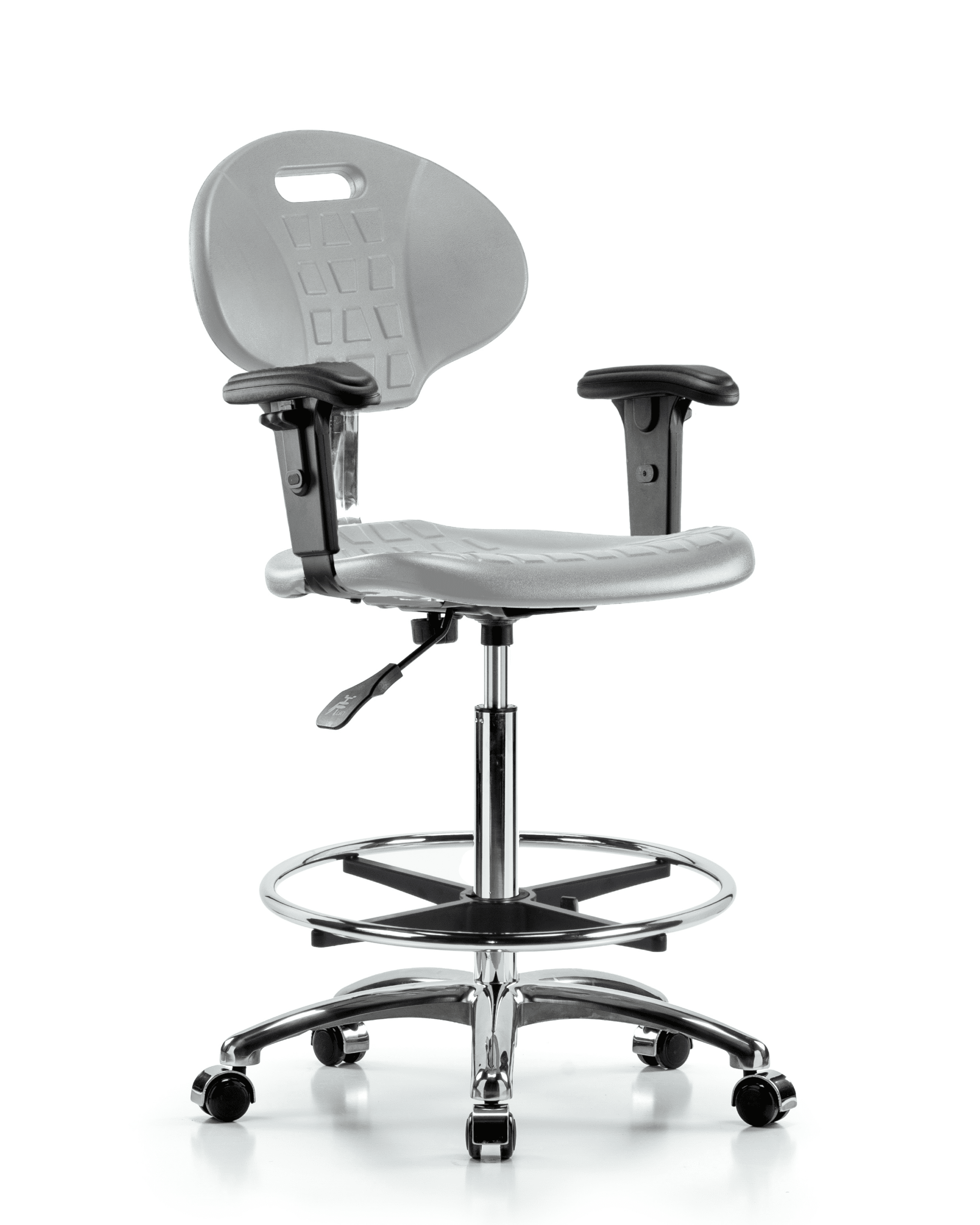 Class 100 Erie Polyurethane Clean Room Chair – High Bench Height with Adjustable Arms, Chrome Foot Ring, & Casters in Gray Polyurethane