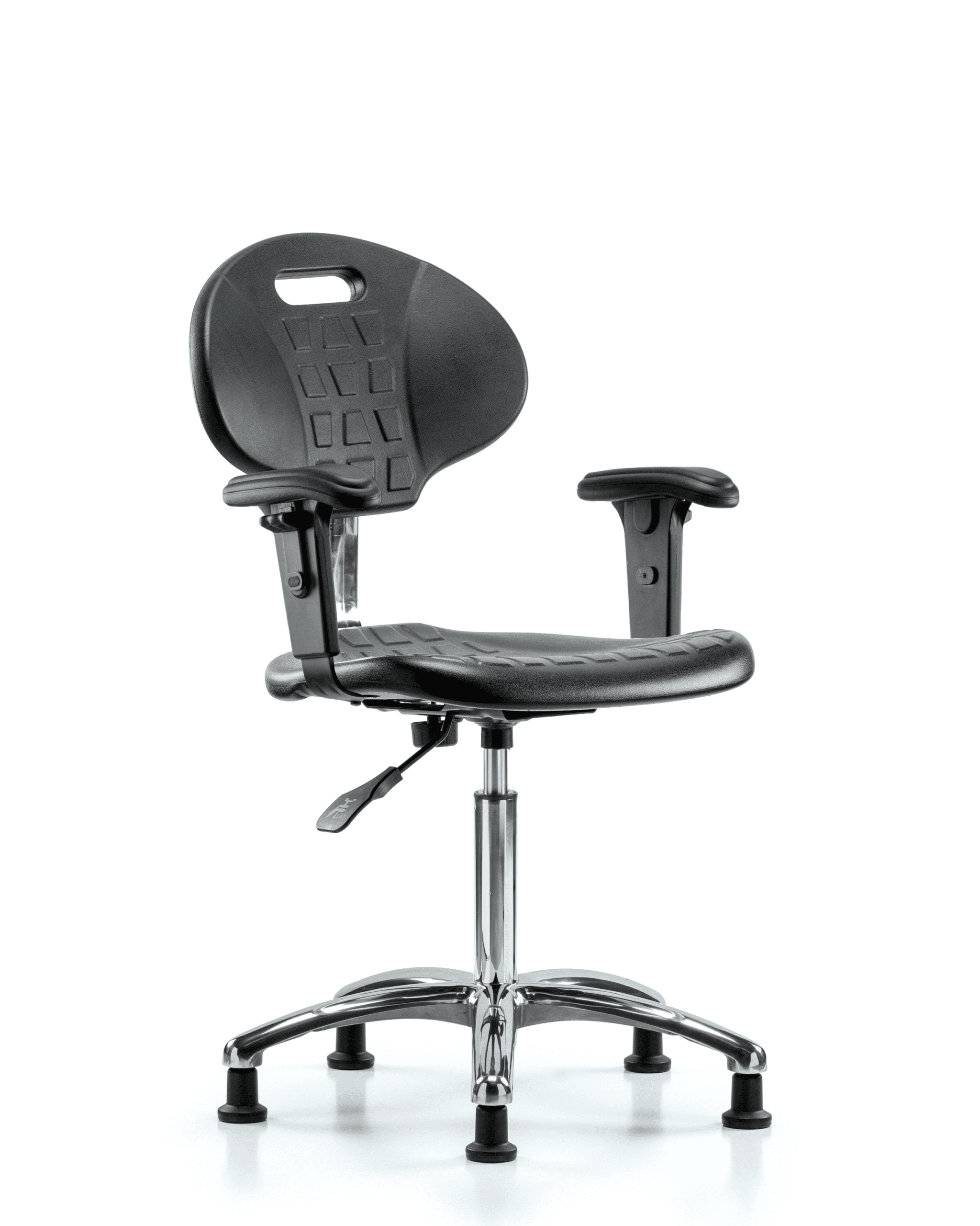Description : Class 100 Clean Room Core Industrial Black Polyurethane Medium Bench Height Chair in Chrome is adjustable from 19.5-27 inches from the top of the seat to the floor and features manual back height and back depth adjustments, built in handle for ease of movement, 2-way adjustable arm rests, and cast-aluminum base with stationary, non-marring glides suitable for hard floors in chemical, soil, and puncture resistant polyurethane.