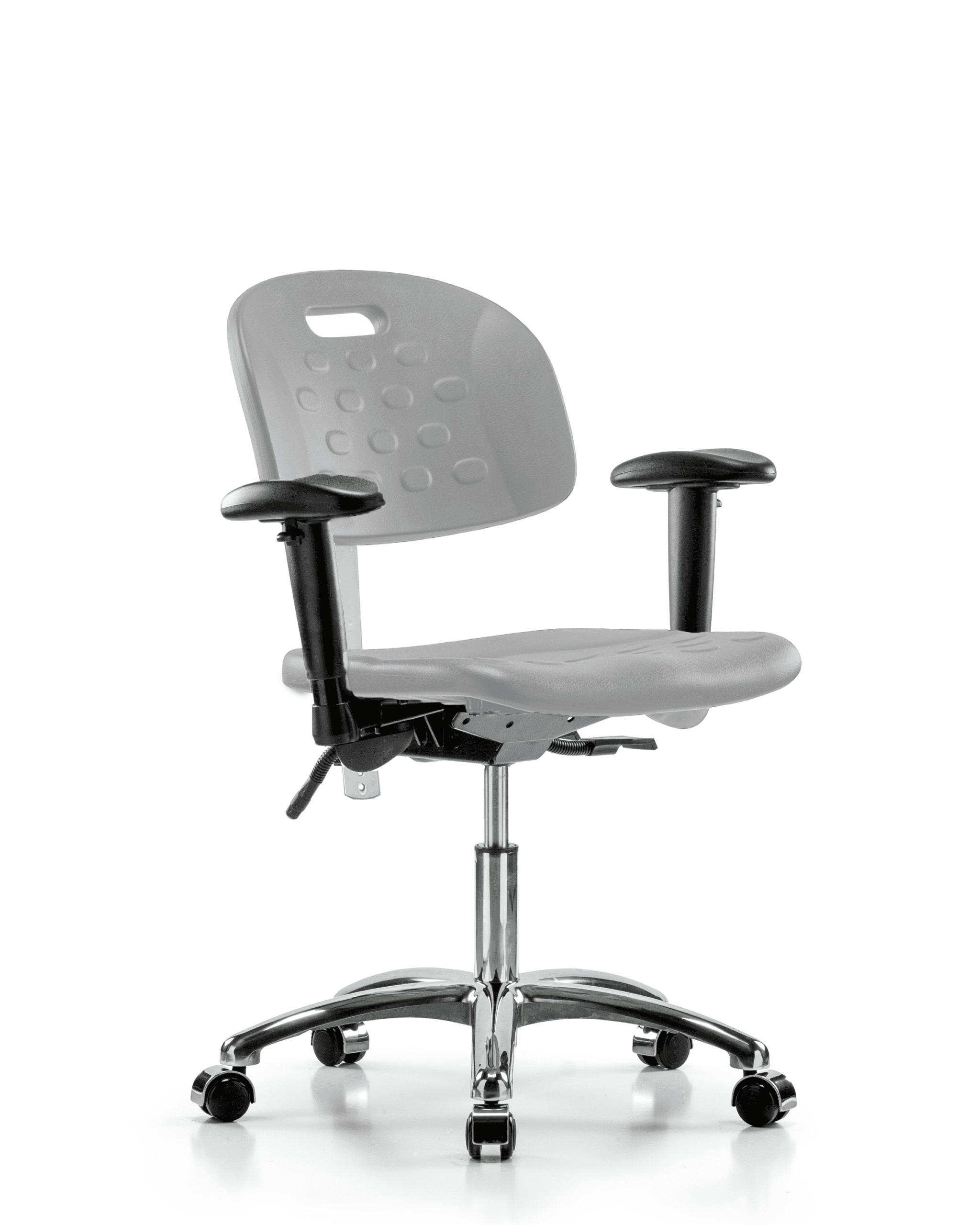 Description : Class 100 Clean Room Industrial Gray Polyurethane Desk Height Chair in Chrome is adjustable from 17.75-23 inches from the top of the seat to the floor and features ergonomic adjustments including seat height and locking back tilt, built in handle for ease of movement, 6-way adjustable arm rests, and cast-aluminum base with chrome-hooded, dual-wheel, self-braking, non-marring casters suitable for hard floors in chemical, soil, and puncture resistant polyurethane.