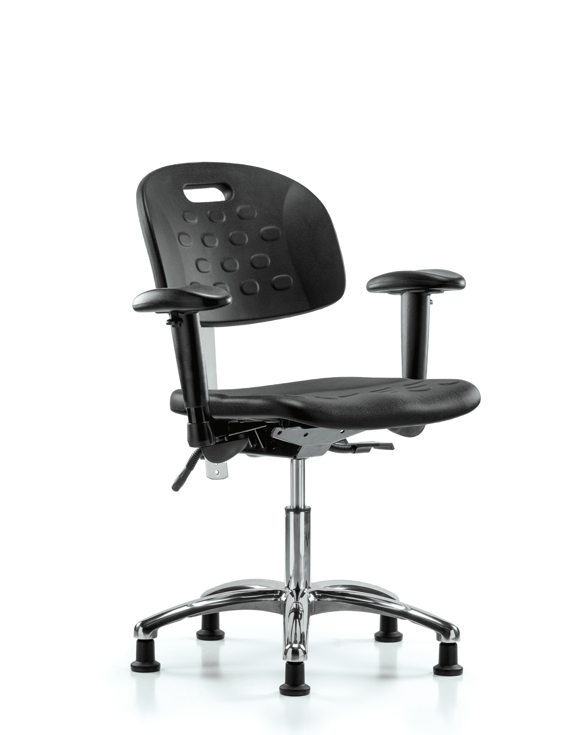 Description : Class 100 Clean Room Industrial Black Polyurethane Desk Height Chair in Chrome is adjustable from 17.75-23 inches from the top of the seat to the floor and features ergonomic adjustments including seat height and locking back tilt, built in handle for ease of movement, 6-way adjustable arm rests, and cast-aluminum base with stationary, non-marring glides suitable for hard floors in chemical, soil, and puncture resistant polyurethane.