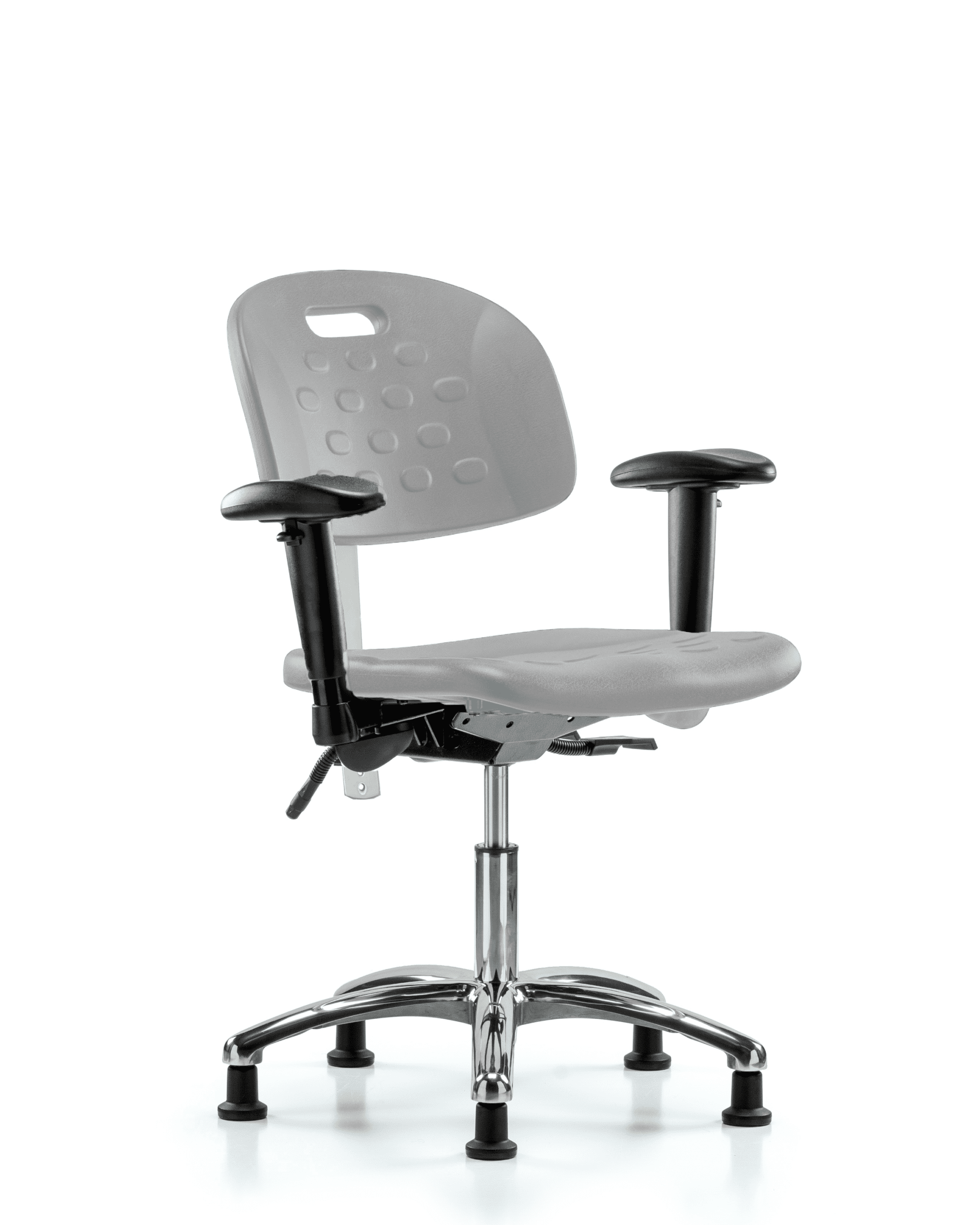 Description : Class 100 Clean Room Industrial Gray Polyurethane Desk Height Chair in Chrome is adjustable from 17.75-23 inches from the top of the seat to the floor and features ergonomic adjustments including seat height and locking back tilt, built in handle for ease of movement, 6-way adjustable arm rests, and cast-aluminum base with stationary, non-marring glides suitable for hard floors in chemical, soil, and puncture resistant polyurethane.