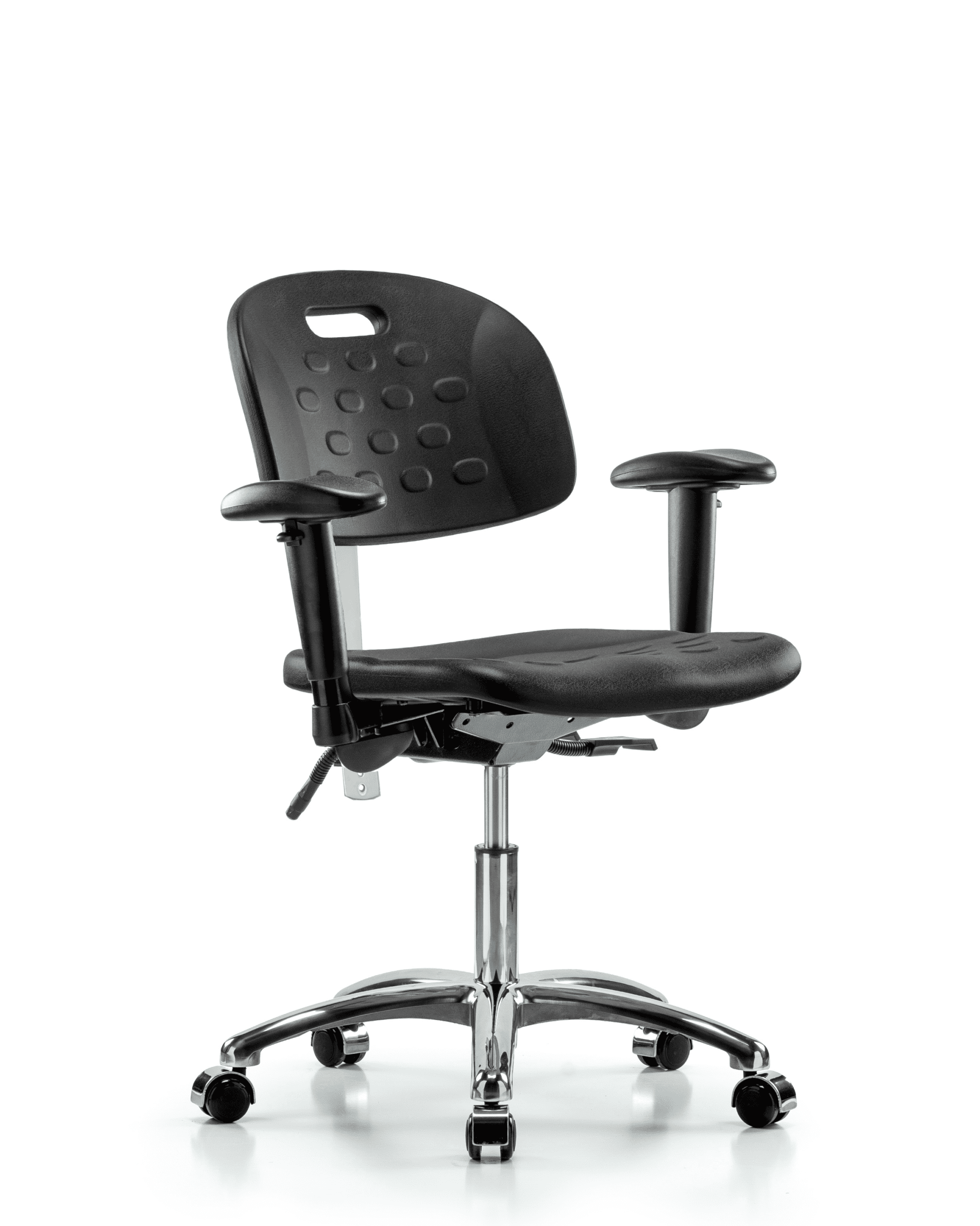 Class 100 Newport Industrial Polyurethane Clean Room Chair – Desk Height with Seat Tilt, Adjustable Arms, & Casters in Black Polyurethane