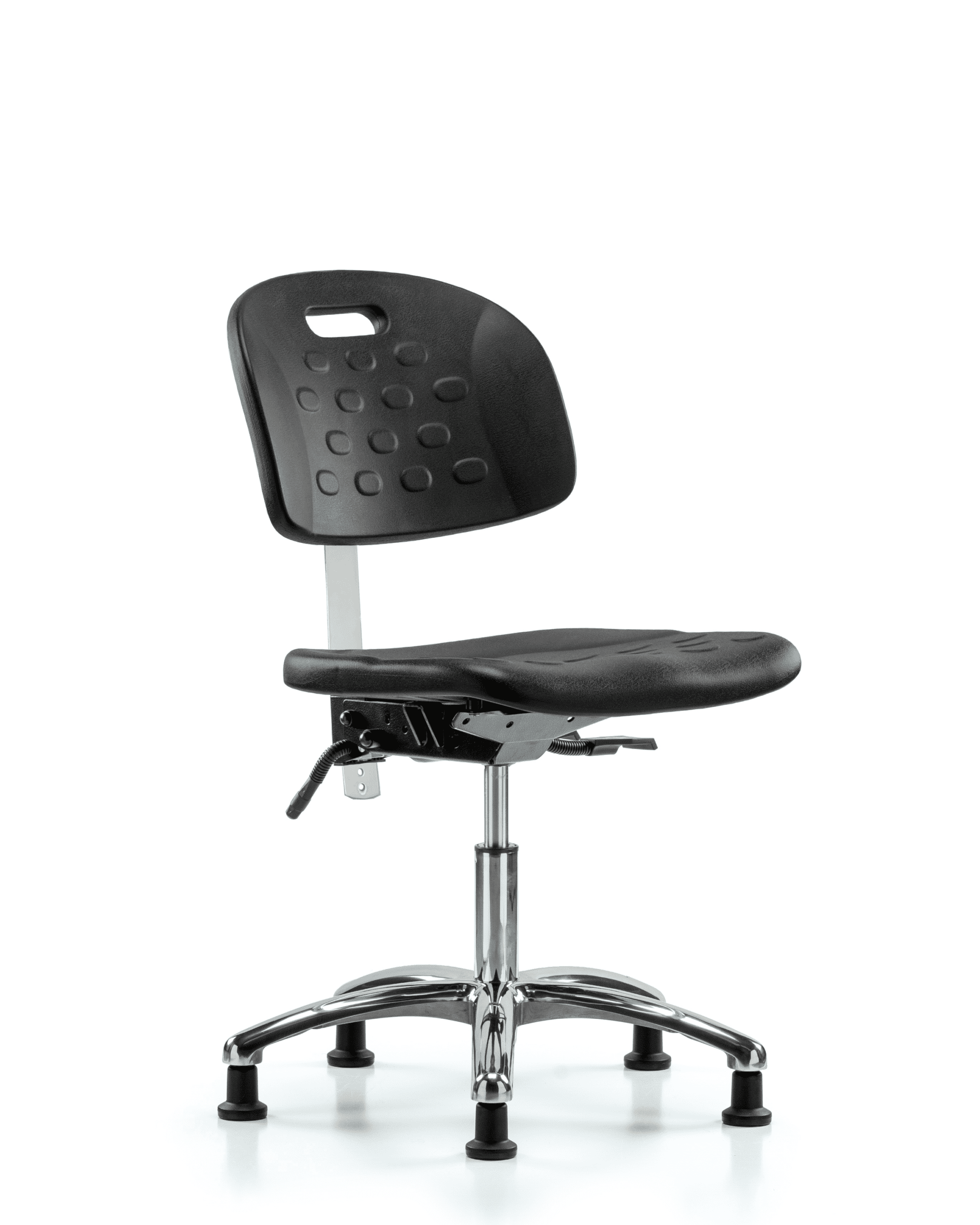Description : Class 100 Clean Room Industrial Black Polyurethane Desk Height Chair in Chrome is adjustable from 17.75-23 inches from the top of the seat to the floor and features ergonomic adjustments including seat height and locking back tilt, built in handle for ease of movement, locking seat tilt, and cast-aluminum base with stationary, non-marring glides suitable for hard floors in chemical, soil, and puncture resistant polyurethane.
