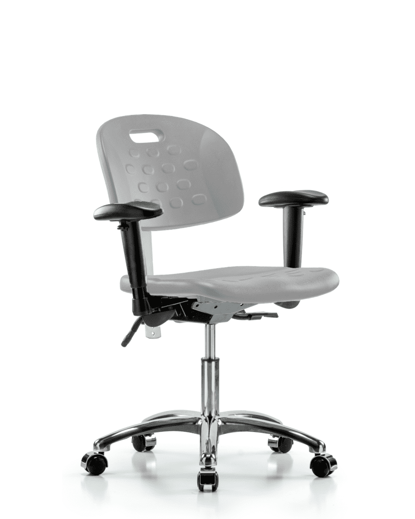 Description : Core Polyurethane Medium Bench Height Chair is adjustable from 18.25-26 inches from the top of the seat to the floor and features manual back and back depth adjustments, black nylon adjustable foot ring, and black, nylon-reinforced fiberglass base with dual-wheel, self-braking, non-marring casters suitable for hard floors in chemical, soil, and puncture resistant polyurethane.