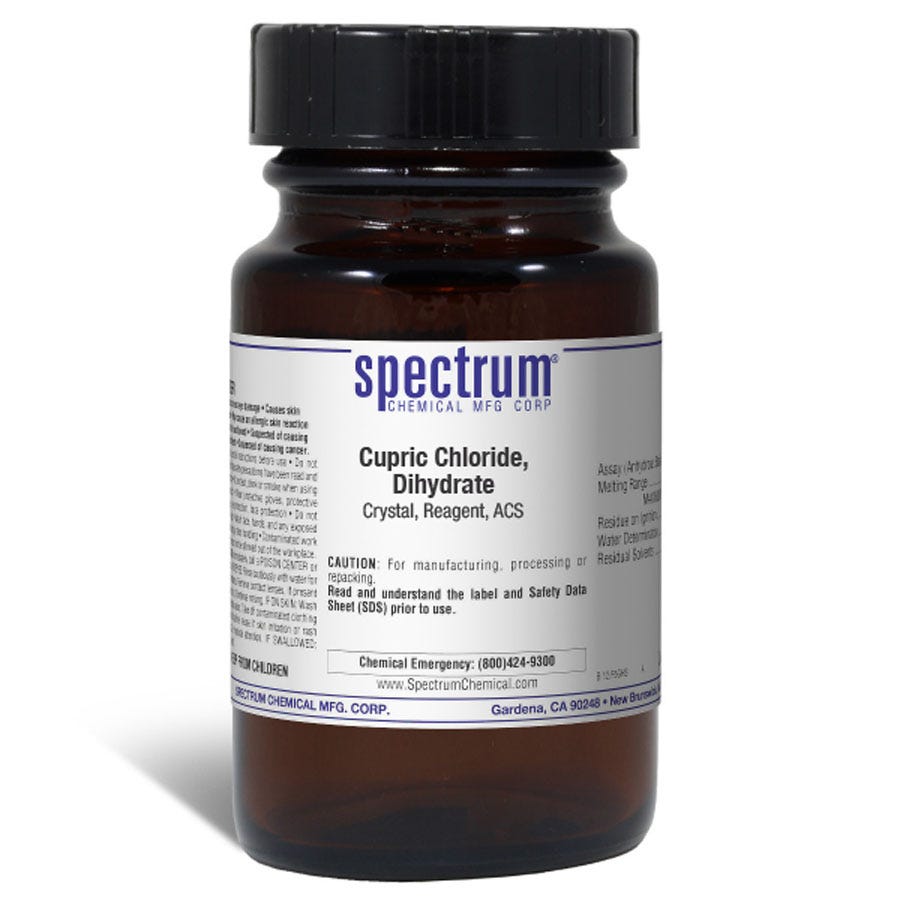 Size quantity: 1-EA Description: Cupric Chloride, Dihydrate, Crystal, Reagent, ACS is also known as copper chloride. It is a chemical compound with a blue green color. Copper (II) chloride is used as a synthetic catalyst, a pyrotechnic coloring agent and in humidity indicator cards. The Reagent grade denotes that this chemical is the highest quality commercially available and that the American Chemical Society has not officially set any specifications for this material. Spectrum Chemical manufactured Reagent grade products meet the toughest regulatory standards for quality and purity.