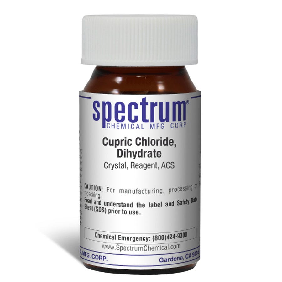 Size quantity: 1-EA Description: Cupric Chloride, Dihydrate, Crystal, Reagent, ACS is also known as copper chloride. It is a chemical compound with a blue green color. Copper (II) chloride is used as a synthetic catalyst, a pyrotechnic coloring agent and in humidity indicator cards. The Reagent grade denotes that this chemical is the highest quality commercially available and that the American Chemical Society has not officially set any specifications for this material. Spectrum Chemical manufactured Reagent grade products meet the toughest regulatory standards for quality and purity.