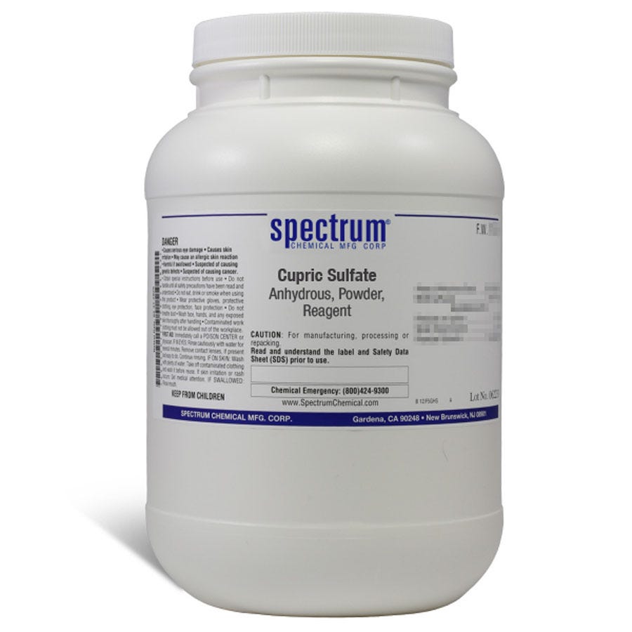 Size quantity: 1-EA Description: Cupric Sulfate, Anhydrous, Powder, Reagent also known as Copper(II) Sulfate is an inorganic pale green or gray-white powder. As an analytical reagent it is used in Benedict’s solution and Fehling’s solution to test for reducing sugars and in Biuret reagent to test for proteins. The Reagent grade denotes that this chemical is the highest quality commercially available and that the American Chemical Society has not officially set any specifications for this material. Spectrum Chemical manufactured Reagent grade products meet the toughest regulatory standards for quality and purity.